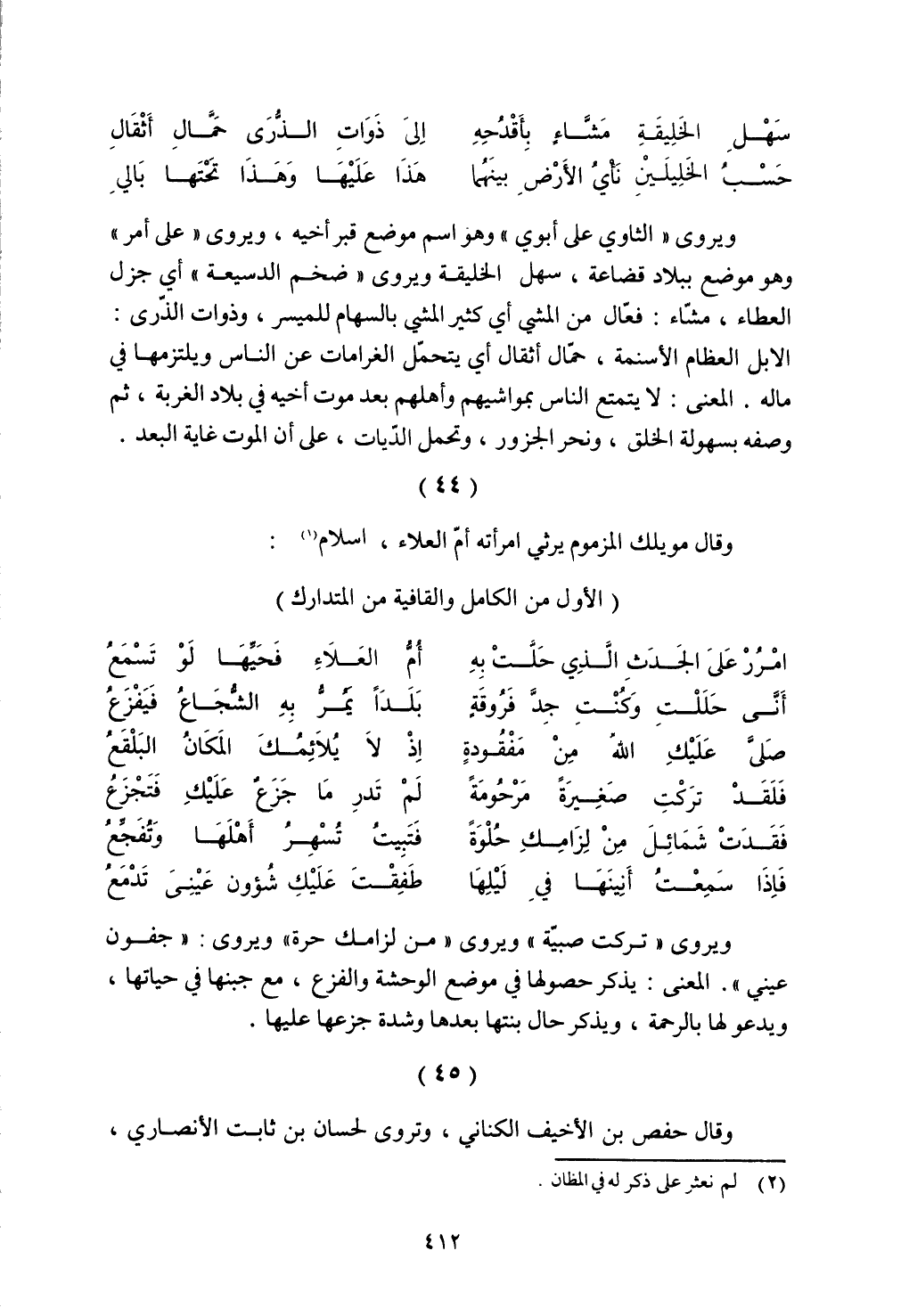 ويروي "الثاوي على أبوي" وهو اسم موضع قبر أخيه، ويروي "على أمر" وهو موضع ببلاد قضاعة، سهل الخليفة ويروي "ضخم الدسيعة" أي جزل العطاء، مشاء: فعال من المشي أي كثير المشي بالسهام للميسر، وذوات الذرى: الإبل العظام الأسنمة، حمال أثقال أي يتحمل الغرامات عن الناس ويلتزمها في ماله. المعنى: لا يتمتع الناس بمشوايهم وأهلهم بعد موت أخيه في بلاد الغربة، ثم وصفه بسهولة الخلق، ونحر الجزور، وتحمل الديات، على أن الموت غاية البعد.