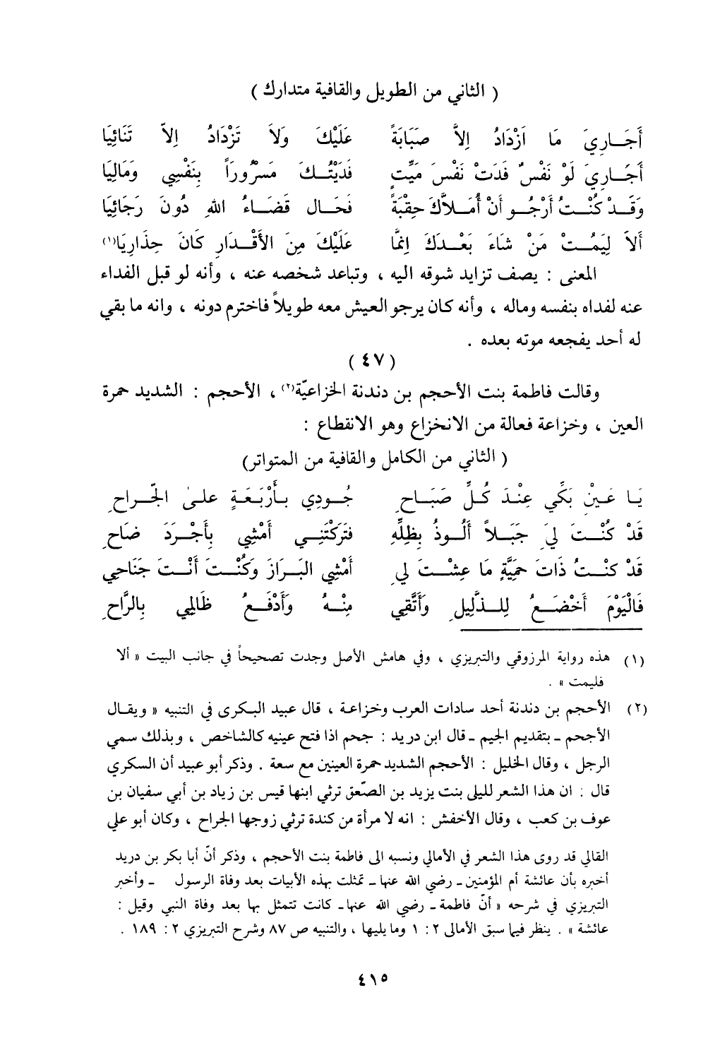 وقالت فاطمة بنت الأحجم بن دندنة الخزاعية، الأحجم: الشديد حمرة العين، وخزاعة فعالة من الانخزاع هو الانقطاع: