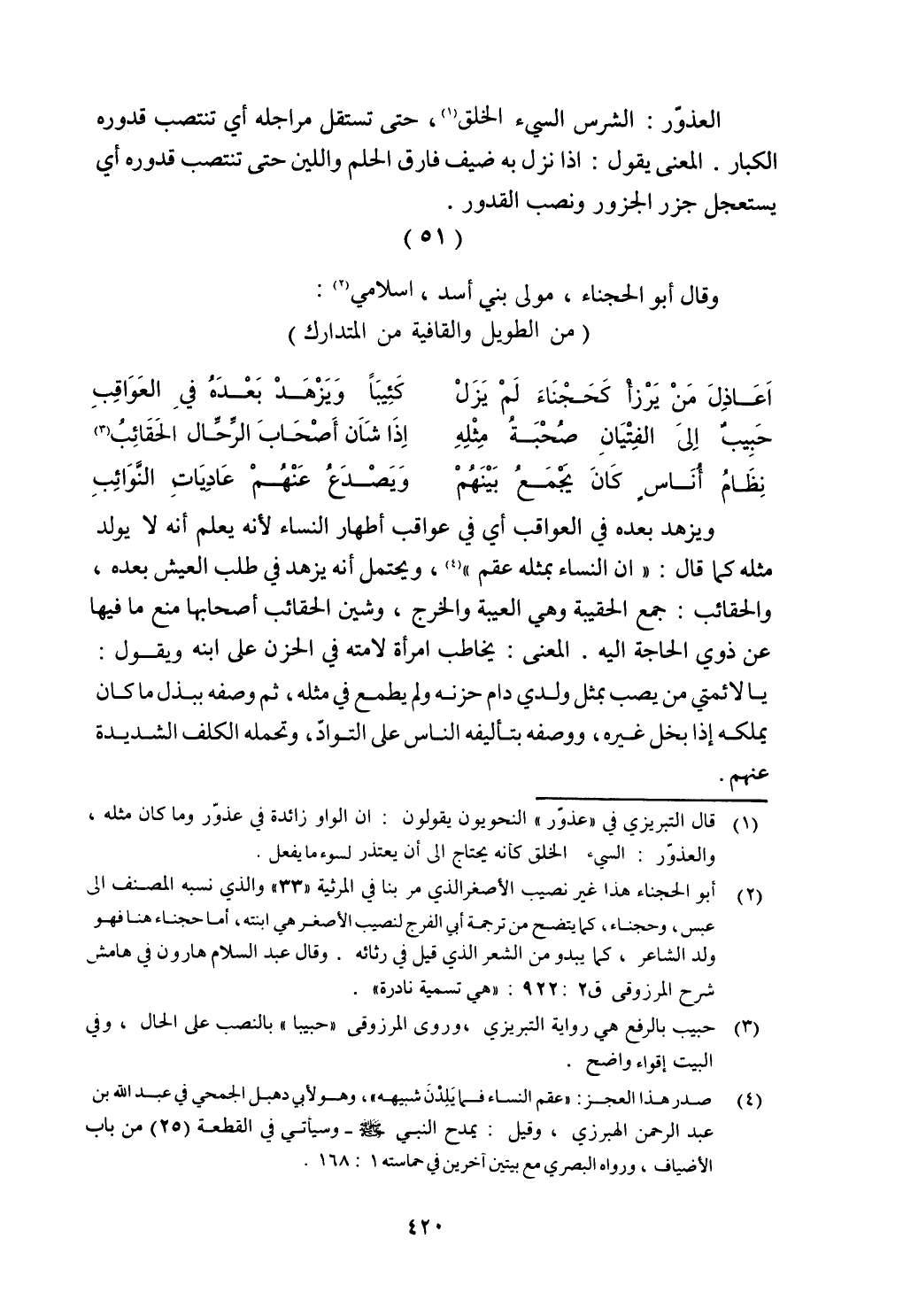 العذور: الشرس السيء الخلق، حتى تستقل مراجله أي تنتصب قدوره الكبار. المعنى يقول: إذا نزل به ضيف فارق الحلم واللين حتى تنتصب قدوره أي يستعجل جزر الجزور ونصب القدور.
