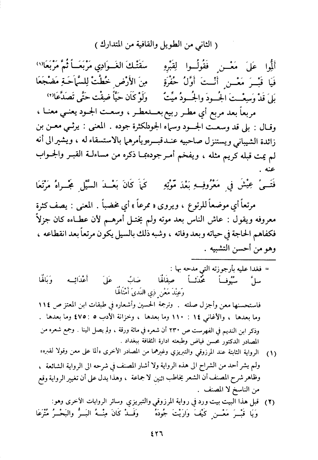 مربعًا بعد مربع أي مطر ربيع بعد مطر، وسعت الجود يعني معنا، وقال: بلى قد وسعت الجود وسماه الجود لكثرة جوده. المعنى: يرثي معن بن زائدة الشيباني ويستنزل صاحبيه عند قبره ويأمرهما بالاستسقاء له، ويشير إلى أنه لم يمت قبله كريم مثله، ويفخم أمر جوده بما ذكره من مساءلة القبر والجواب عنه.