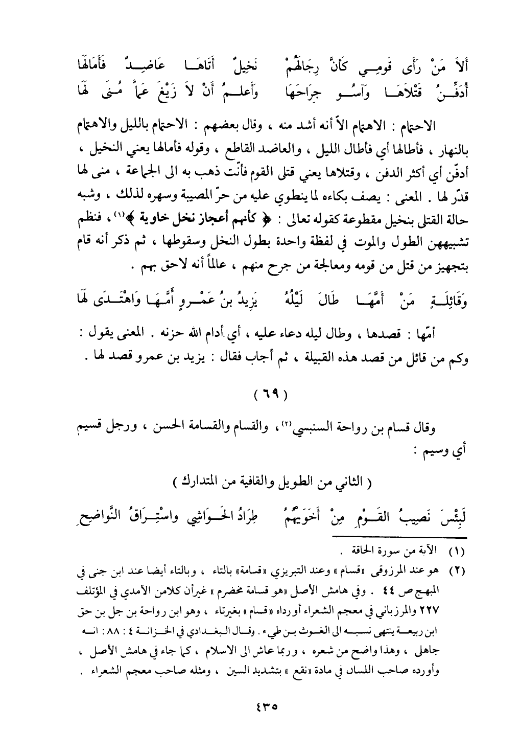 الاحتمام: الاهتمام إلا أنه أشد منه، وقال بعضهم: الاحتمام بالليل والاهتمام بالنهار، فأطالها أي فأطال الليل، والعاضد القاطع، وقوله فأمالها يعني النخيل، أدفن أي أكثر الدفن، وقتلاها يعني قتلى القوم فأنت ذهب به إلى الجماعة، منى لها قدر لها. المعنى: يصف بكاءه لما ينطوي عليه من حر المصيبة وسهره لذلك، وشبه حالة القتلى بنخيل مقطوعة كقوله تعالى: {كَأَنَّهُمْ أَعْجَازُ نَخْلٍ خَاوِيَةٍ}، فنظم تشبيههن الطول والموت في لفظة واحدة بطول النخل وسقوطها، ثم ذكر أنه قام بتجهيز من قتل من قومه ومعالجة من جرح منهم، عالمًا أنه لا حق بهم.