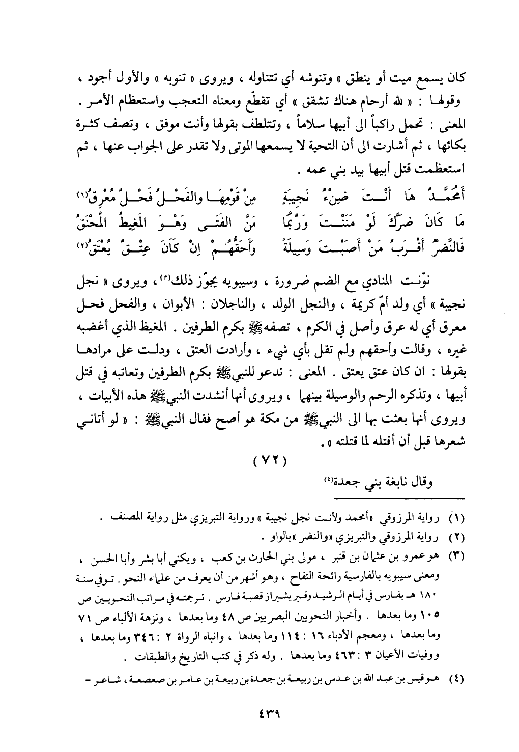 نونت المنادي مع الضم ضرورة، وسيبويه يجوز ذلك، ويروى "نجل نجيبة" أي ولد أم كريمة، والنجل الولد، والناجلان: الأبوان، والفحل فحل معرق أي له عرق وأصل في الكرم، تصفه صلى الله عليه وسلم بكرم الطرفين. المغيظ الذي أغضبه غيره، وقالت وأحقهم ولم تقل بأي شيء، وأرادت العتق، ودلت على مرادها بقولها: إن كان عتق يعتق. المعنى: تدعو النبي صلى الله عليه وسلم بكرم الطرفين وتعاتبه في قتل أبيها، وتذكره الرحم والوسيلة بينهما، ويروي أنها أنشدت النبي صلى الله عليه وسلم هذه الأبيات، ويروى أنها بعثت بها إلى النبي صلى الله عليه وسلم من مكة هو أصح فقال النبي صلى الله عليه وسلم: "لو أتاني شعرها قبل أن أقتله لما قتلته".