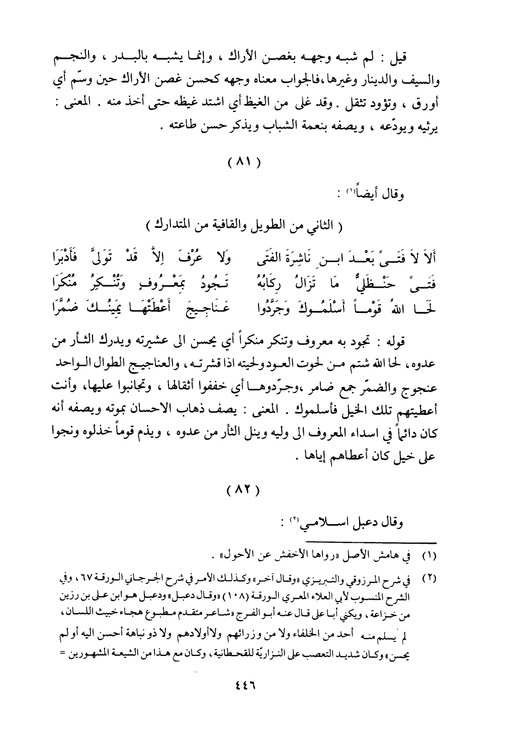 قوله: تجود به معروف وتنكر منكرًا أي يحسن إلى عشيرته ويدرك الثأر من عدوه، لحا الله شتم من لحوت العود ولحيته إذا قشرته، والعناجيج الطوال الواحد عنجوج والضمر جمع ضامر، وجردوها أي خففوا أثقالها، وتجانبوا عليها، وأنت أعطيتهم تلك الخيل فأسلموك. المعنى: يصف ذهاب الإحسان بموته ويصفه أنه كان دائمًا في إسداء المعروف إلى وليه وينل الثأر من عدوه، ويذم قومًا خذلوه ونجوا على خيل كان أعطاهم إياها.