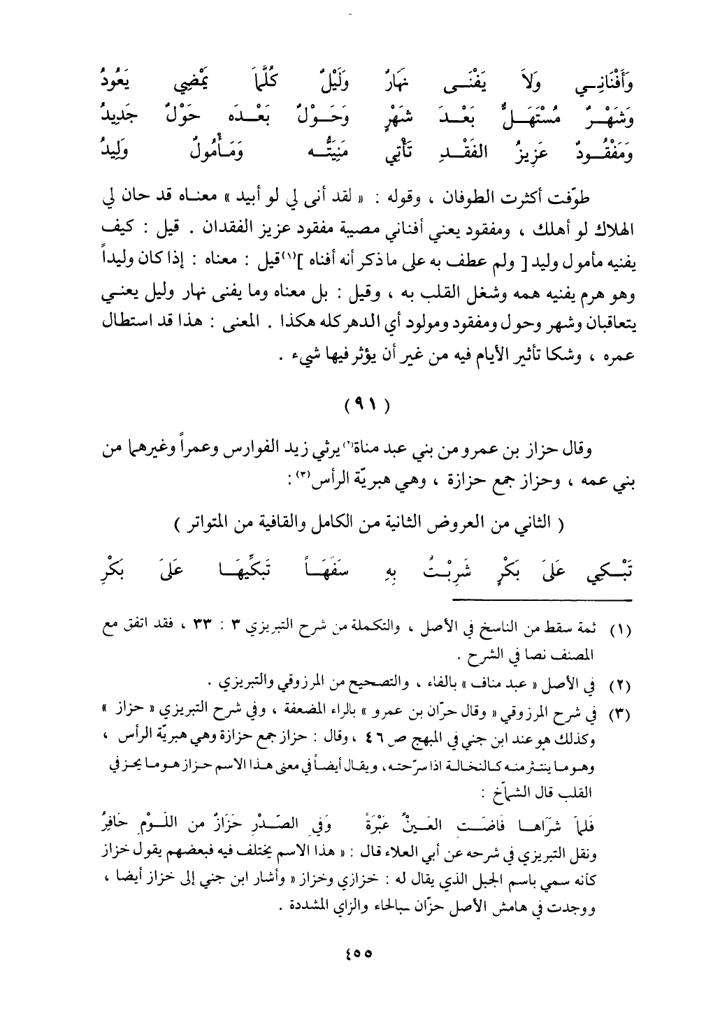 طوفت أكثرت الطوفان، وقوله: "لقد أني لي لو أبيد" معناه قد حان الهلاك لو أهلك، ومفقود يعني مصيبة مفقود عزيز الفقدان. قيل: كيف يفنيه مأمول وليد [ولم عطف به على ما ذكر أنه أفناه] قيل: معناه: إذا كان وليدًا وهو هرم يفنيه همه وشغل القلب به، وقيل: بل معناه وما يفني نهار وليل يعني يتعاقبان وشهر وحول ومفقود ومولود أي الدهر كله هكذا. المعنى: هذا قد استطال عمره، وشكا تأثير الأيام فيه من غير أن يؤثر فيها شيء.