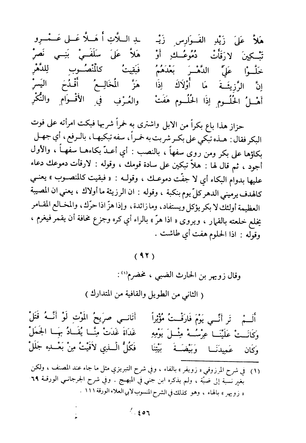 حزاز هذا باع بكرًا من الإبل واشترى به خمرًا شربها فبكت امرأته على فوت البكر فقال: هذه تبكي على بكر شربت به خمرًا، سفه تبكيها، بالرفع أي جهل بكاؤها على بكر ومن روى سفهًا، بالنصب: أي أعد بكاءها سفهًا، والأول أجود، ثم قال لها: هلا تبكين على سادة قومك، وقوله: لارقأت دموعك دعاء عليها بدوام البكاء أي لا جفت دموعك، وقوله: "فبقيت كالمنصوب" يعني كالهدف يرميني الدهر كل يوم بنكبة، وقوله: إن الرزئية ما أولاك، يعني أن المصيبة العظيمة أولئك لا بكر يؤكل ويستفاد، وما زائدة، وإذا هز إذا حرك، والمخالع المقامر يخلع خلعته بالقمار، ويروي "إذا هر" بالراء أي كره وجزع مخافة أن يقمر فيغرم، وقوله: إذا الحلوم هفت أي طاشت.