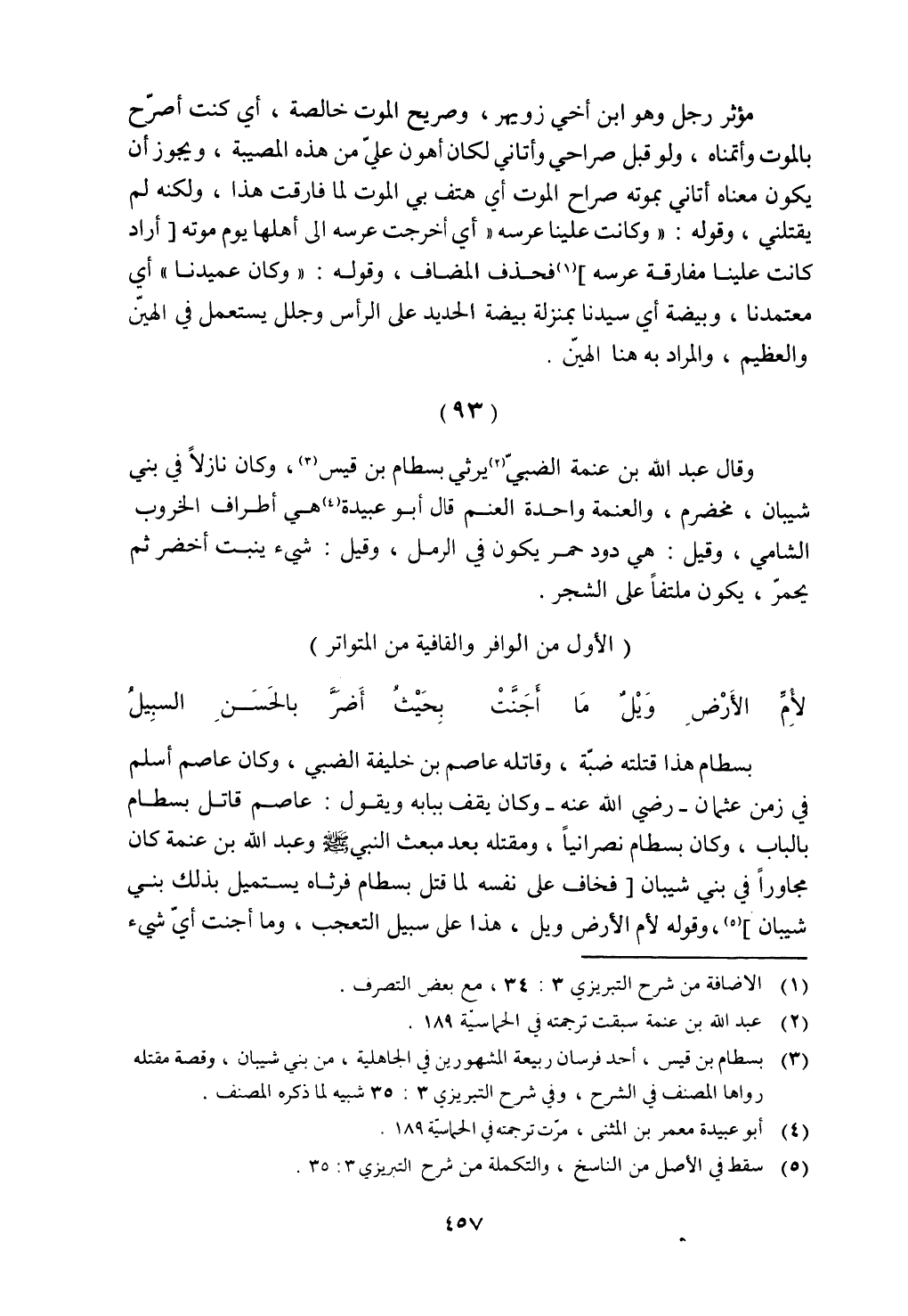 بسطام هذا قتلته ضبة، وقاتله عاصم بن خليفة الضبي، وكان عاصم أسلم في زمن عثمان - رضي الله عنه - وكان يقف ببابه ويقول: عاصم قاتل بسطام بالباب، وكان بسطام نصرانيًا، ومقتله بعد مبعث النبي صلى الله عليه وسلم وعبد الله بن عنمة كان مجاورًا في بني شيبان [فخاف على نفسه لما قتل بسطام فرثاه يستميل بذلك بني شيبان]، وقوله لأم الأرض ويل، هذا على سبيل التعجب، وما أجنت أي شيء