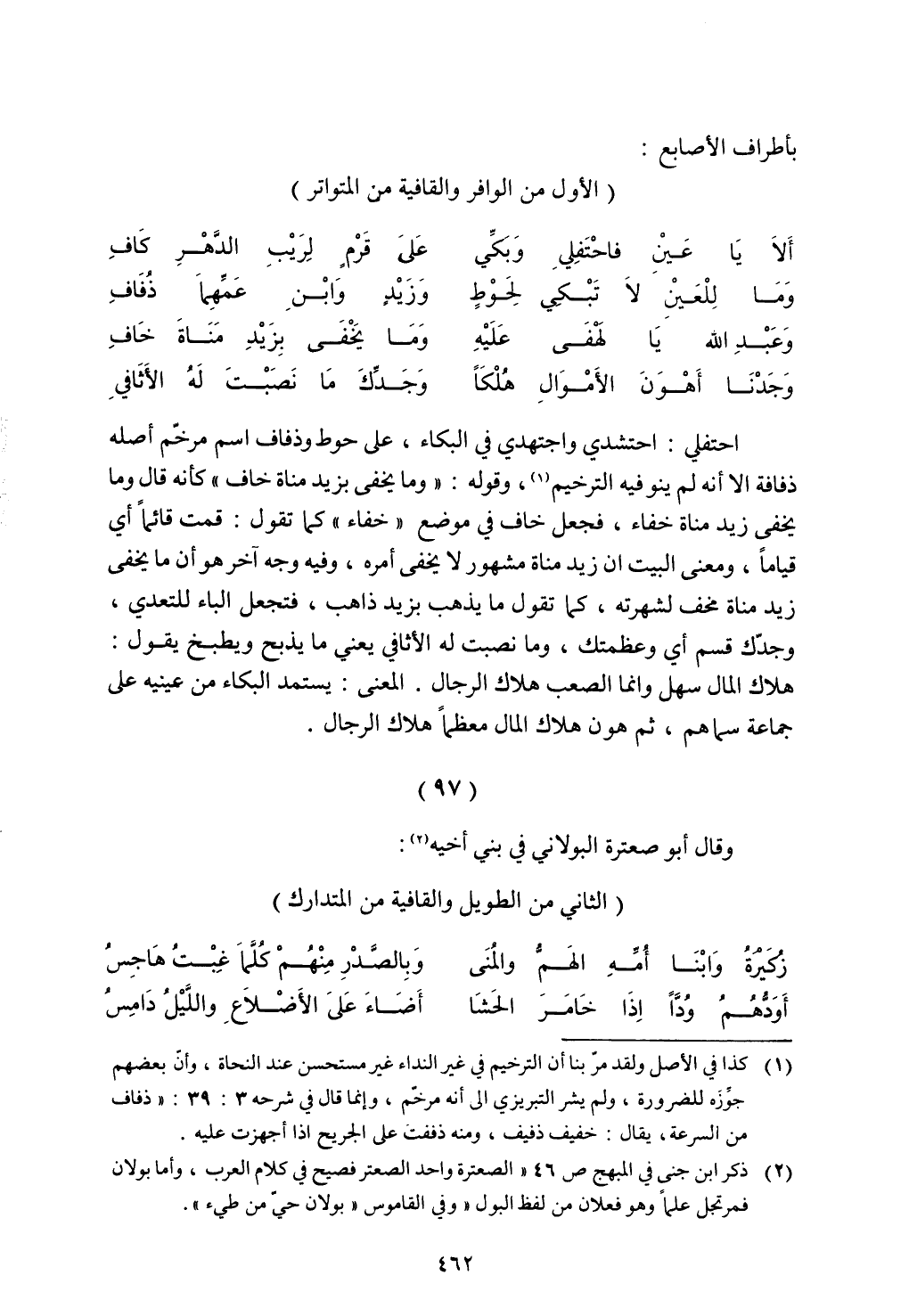 احتفلي: احتشدي واجتهدي في البكاء، على حوط وذفاف اسم مرخم أصله ذفافة إلا أنه لم ينو فيه الترخيم، وقوله: "وما يخفى بزيد مناة خاف" كأنه قال وما يخفى زيد مناة خفاء، فجعل خاف في موضع "خفاء" كما تقول: قمت قائمًا أي قيامًا، ومعنى البيت أن زيد مناة مشهور لا يخفى أمره، وفيه وجه آخر هو أن ما يخفى زيد مناة مخف لشهرته، كما تقول ما يذهب بزيد ذاهب، فتجعل الباء للتعدي، وجدك قسم أي وعظمتك، وما نصبت له الأثافي يعني ما يذبح ويطبخ يقول: هلاك المال سهل وإنما الصعب هلاك الرجال. المعنى: يستمد البكاء من عينيه على جماعة سماهم، ثم هون هلاك المال معظمًا هلاك الرجال.