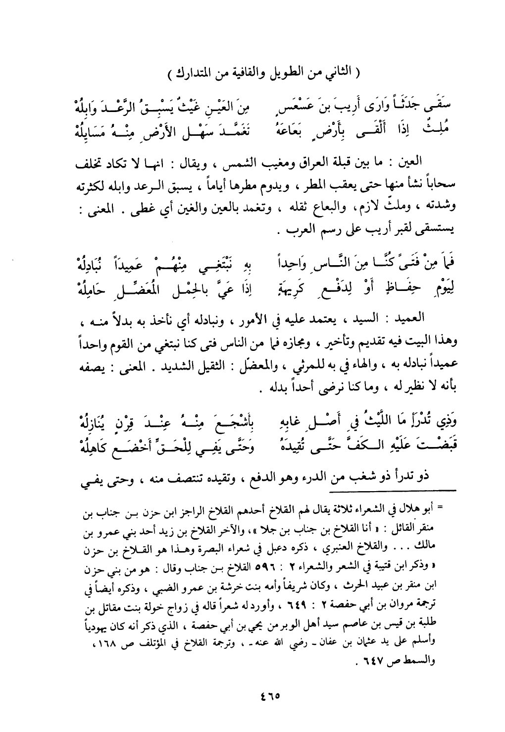 العين: ما بين قبلة العراق ومغيب الشمس، ويقال: إنها لا تكاد تخلف سحابًا نشأ منها حتى يعقب المطر، ويدوم مطرها أيامًا، يسبق الرعد وابله لكثرته وشدته، وملث لازم، والبعاع ثقله، وتغمد بالعين والغين أي غطى. المعنى: يستسقى لقبر أريب على رسم العرب.