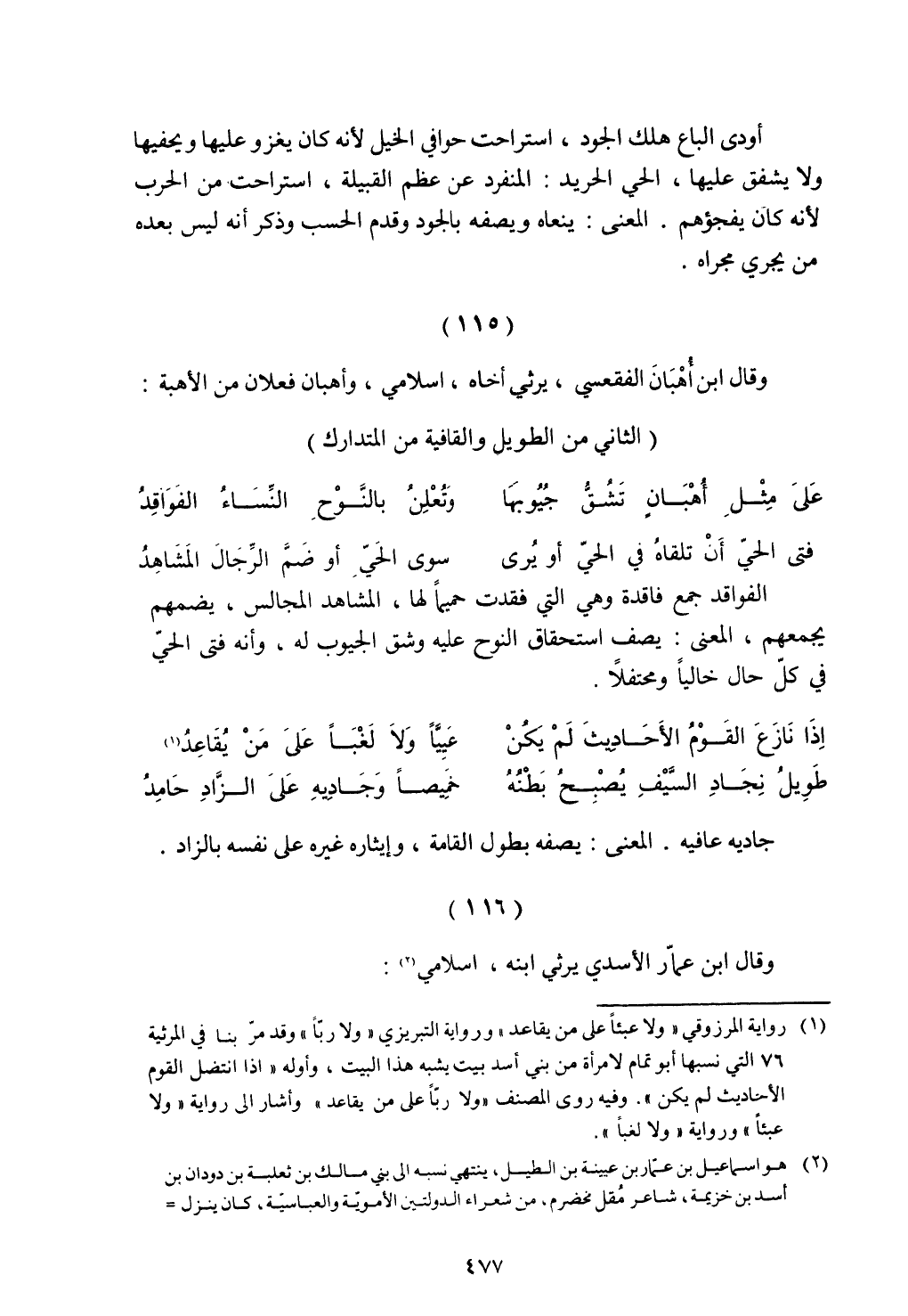أودى الباع هلك الجود، استراحت حوافي الخيل لأنه كان يغزو عليها ويحفيها ولا يشفق عليها، الحي الحريد: المنفرد عن عظم القبيلة، استراحت من الحرب لأنه كان يفجؤهم. المعنى: ينعاه ويصفه بالجود وقدم الحسب وذكر أنه ليس بعده من يجري مجراه.