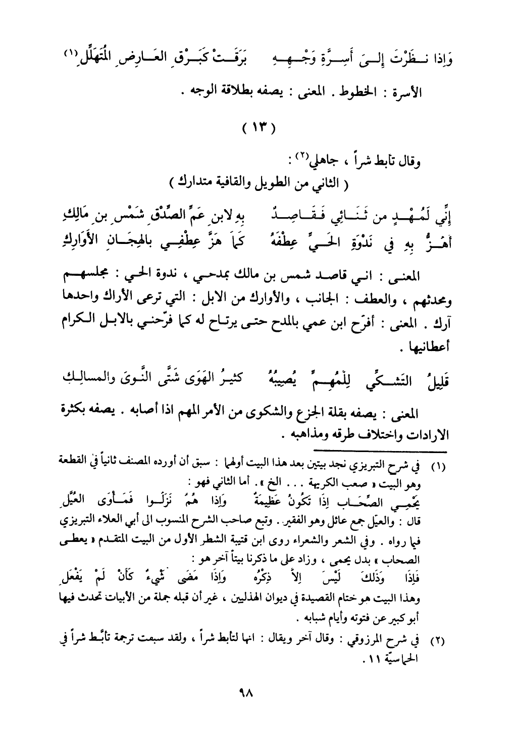 المعنى: إني قاصد شمس بن مالك بمدحي, ندوة الحي: مجلسهم ومحدثهم, والعطف: الجانب, والأوراك من الإبل: التي ترعى الأراك واحدها آرك. المعنى: أفرح ابن عمي بالمدح حتى يرتاح له كما فرحني بالإبل الكرام أعطانيها.