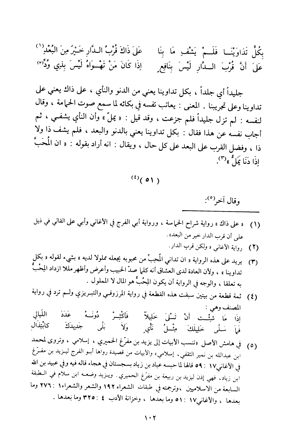 جليدًا أي جلدًا، بكل تداوينا يعني من الدنو والنأي، على ذاك يعني على تداوينا وعلى تجيبنا. المعنى: يعاتب نفسه في بكائه لما سمع صوت الحمامة، وقال لنفسه: لم تزل جليدًا فلم جزعت، وقد قيل: "يمل" وأن النأي يشفي، ثم أجاب نفسه عن هذا فقال: بكل تداوينا يعني بالدنو والبعد، فلم يشف ذا ولا ذا، وفضل القرب على البعد على كل حال، ويقال: أنه أراد بقوله: "أن المحب إذا دنا يمل".