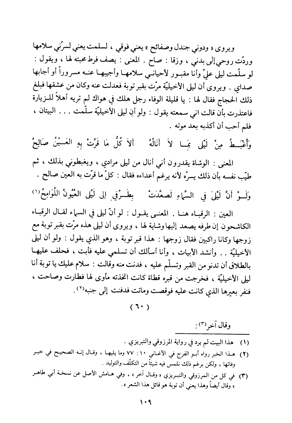 ويروى "ودوني جندل وصفائح" يعني فوقي، لسلمت يعني لسرني سلامها وردت روحي إلى بدني، وزقا: صاح. المعنى: يصف فرط محبته لها، ويقول: لو سلمت ليلي عليّ وأنا مقبور أحياني سلامها وأجيبها عنه مسرورًا أو أجابها صداي. ويرى أن ليلى الأخيلية مرت بقبر توبة فعدلت عنه وكان من عشقها فبلغ ذلك الحجاج فقال لها: يا قليلة الوفاء رجل هلك في هواك لم تريه أهلاً للزيارة فاعتذرت بأن قالت أني سمعته يقول: ولو أن ليلى الأخيلية سلّمت ... ألبيتان، فلم أحب أن أكذبه بعد موته.