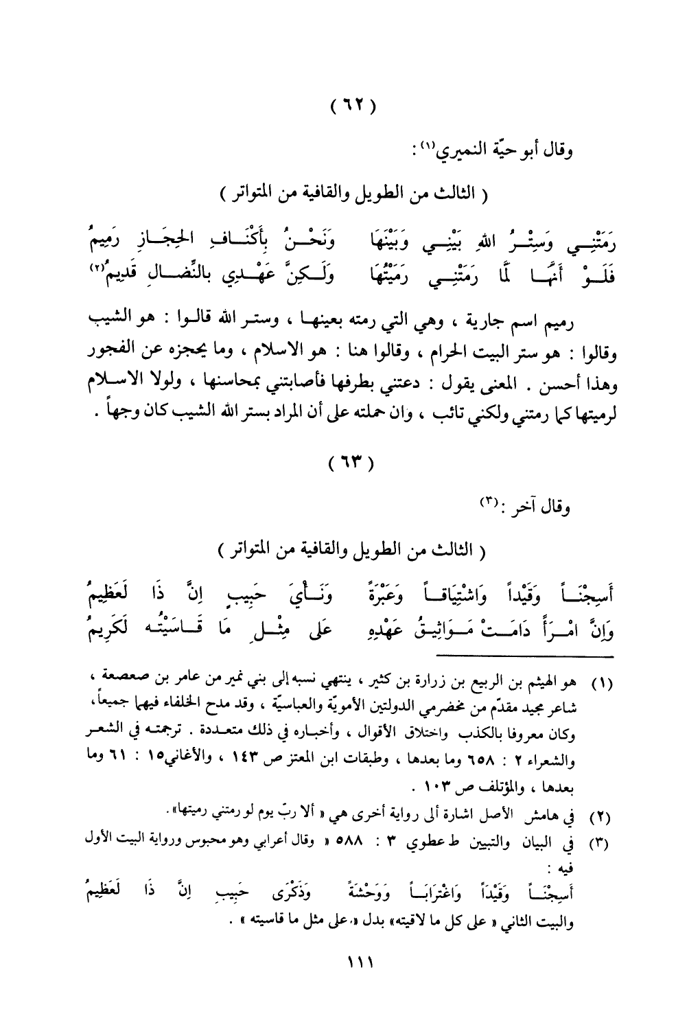 رميم اسم جارية، وهي التي رمته بعينها، وستر الله قالوا: هو الشيب وقالوا: هو ستر البيت الحرام، وقالوا هنا: هو الإسلام، وما يحجزه عن الفجور وهذا أحسن. المعنى يقول: دعتنى بطرفها فأصابتني بمحاسبنها، ولولا الإسلام لرميتها كما رمتني ولكني نائب، وإن حملته على أن المراد بستر الله الشيب كان وجهًا.