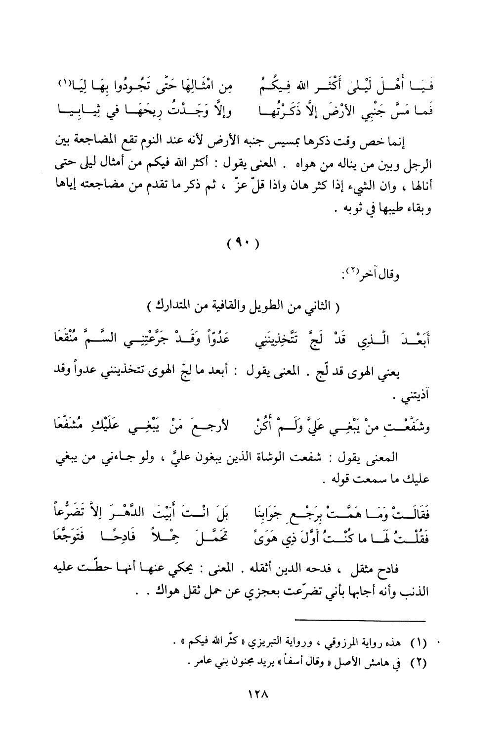 إنما خص وقت ذكرها بمسيس جنبه الأرض لأنه عند النوم تقع المضاجعة بين الرجل وبين من يناله من هواه. المعنى يقول: أكثر الله فيكم من أمثال ليلى حتى أنالها، وإن الشيء إذا كثر هان وإذا قل عز، ثم ذكر ما تقدم من مضاجعته إياها وبقاء طيبها في ثوبه.