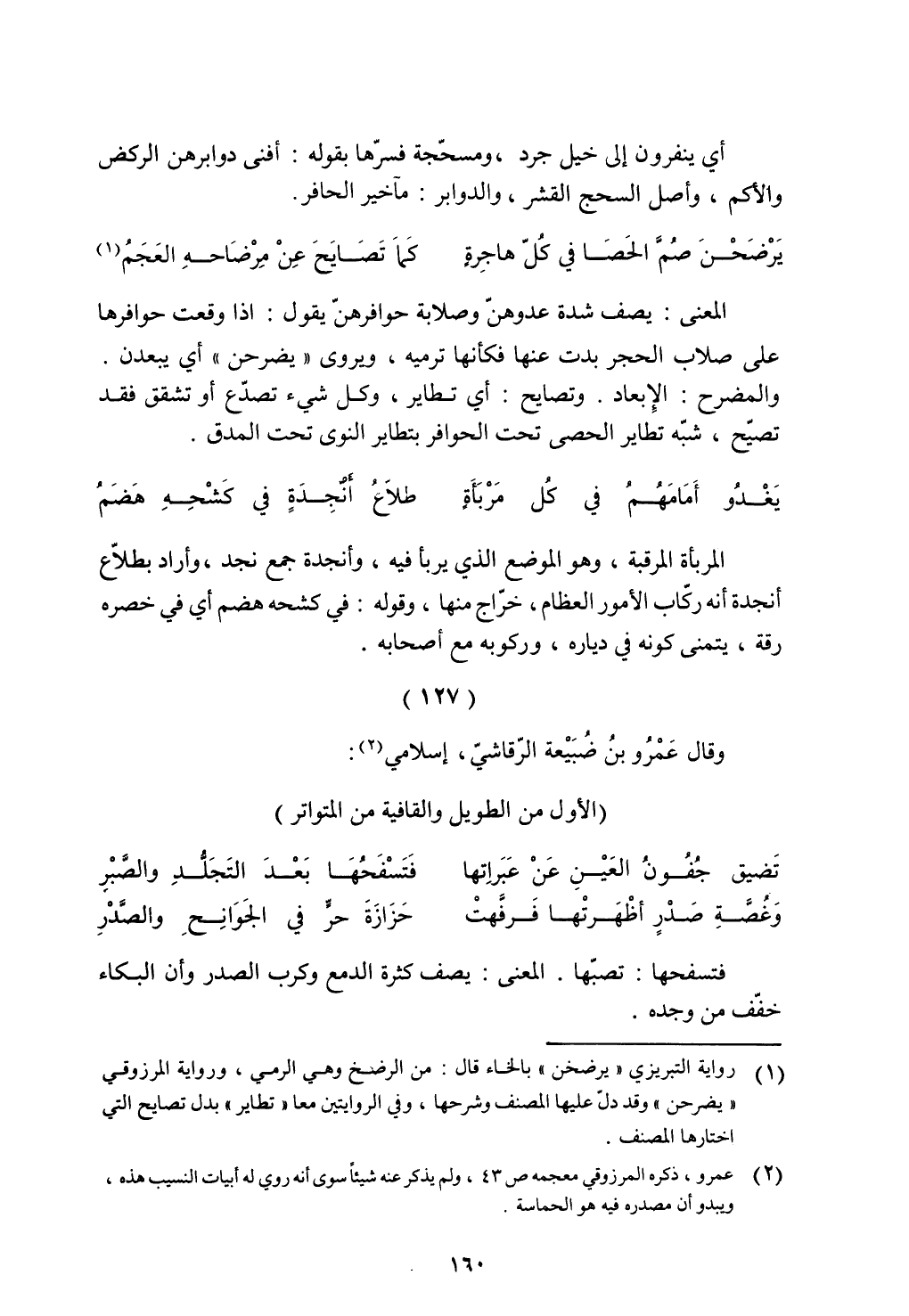 أي ينفرون إلى خيل جرد، ومسحجة فسرها بقوله: أفنى دوابرهن الركض والأكم، وأصل السحج القشر، والدوابر: مآخير الحافر.