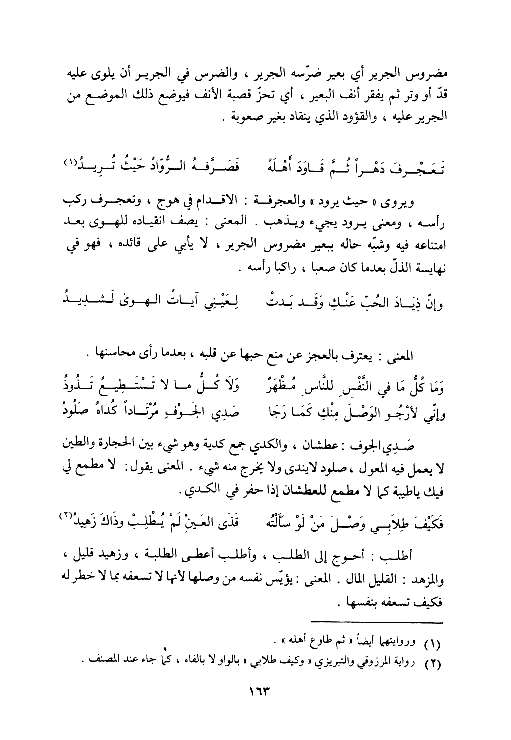 ويروى "حيث يرود" والعجرفة: الاقدام في هوج، وتعجرف ركب رأسه، ومعنى يرود يجيء ويذهب. المعنى: يصف انقياده للهوى بعد امتناعه فيه وشبه حاله ببعير مضروس الجرير، لا يأبي على قائده، فهو في نهاية الذل بعدما كان صعبًا، راكبًا رأسه.