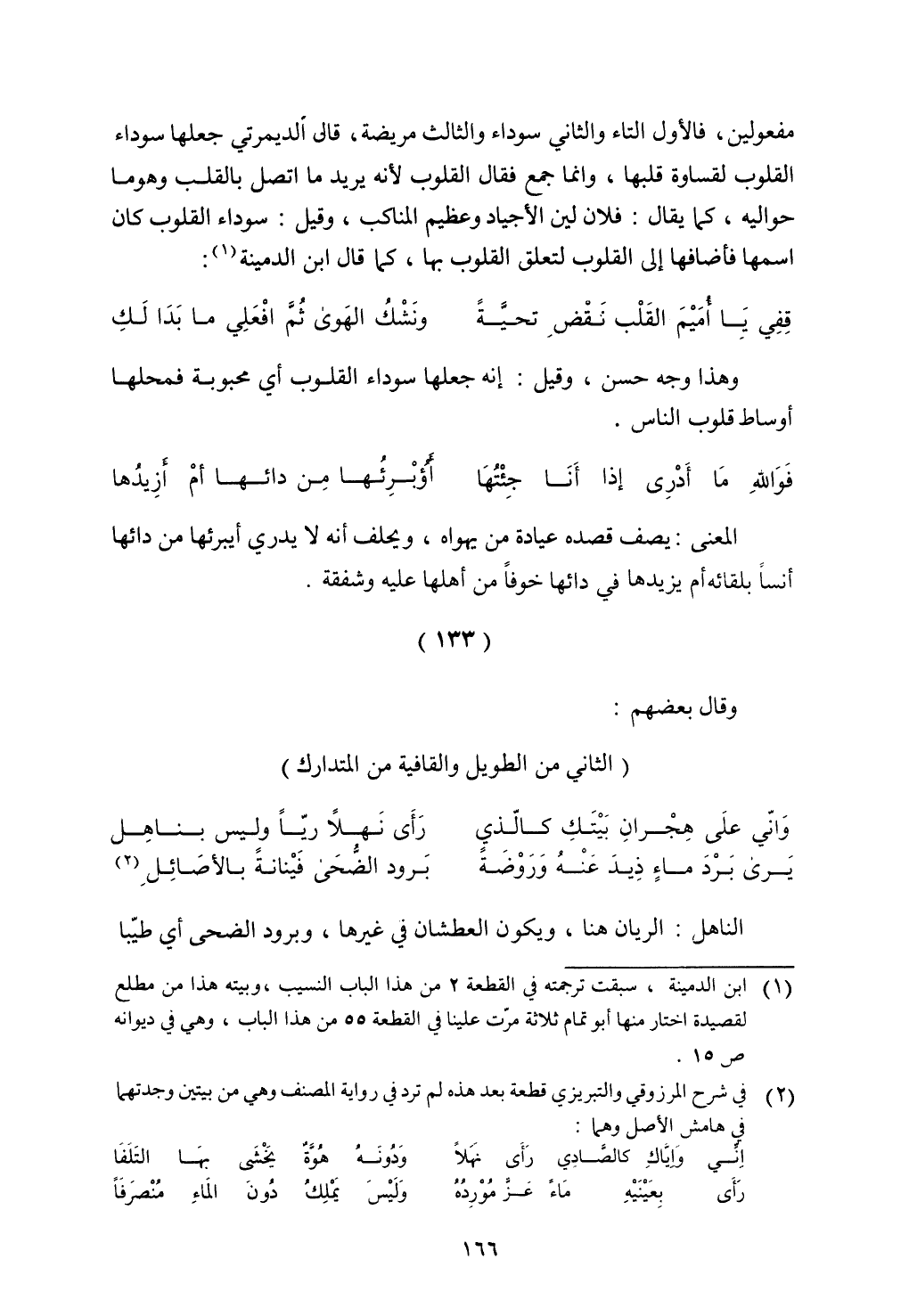 مفعولين، فالأول التاء والثاني سوداء والثالث مريضة، قال الديمرتي جعلها سوداء القلوب لقساوة قلبها، وإنما جمع فقال القلوب لأنه يريد ما اتصل بالقلب وهو ما حواليه، كما يقال: فلان لبن الأجياد وعظيم المناكب، وقيل: سوداء القلوب كان اسمها فأضافها إلى القلوب لتعلق القلوب بها، كما قال ابن الدمينة: