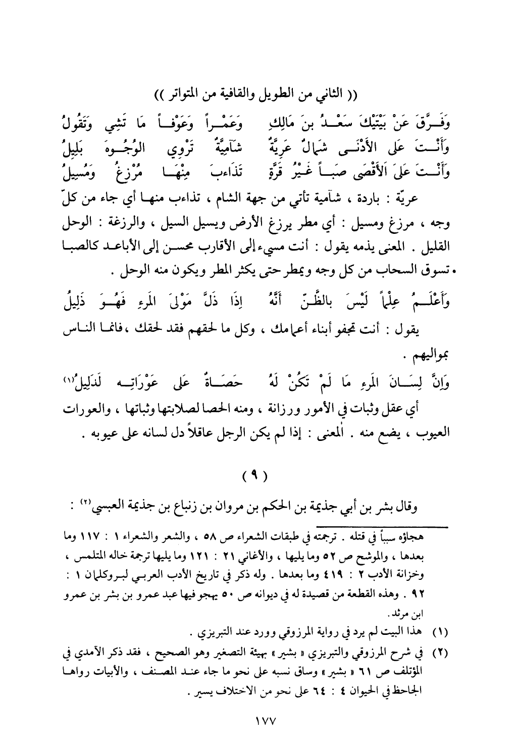 عرية: باردة، شامية تأتي من جهة الشام، تذاءب منها أي جاء من كل وجه، مرزغ ومسيل: أي مطر يرزغ الأرض ويسيل السيل، والرزغة: الوحل القليل. المعنى يذمه يقول: أنت مسيء إلى الأقارب محسن إلى الأباعد كالصبا. تسوق السحاب من كل وجه ويمطر حتى يكثر المطر ويكون منه الوحل.