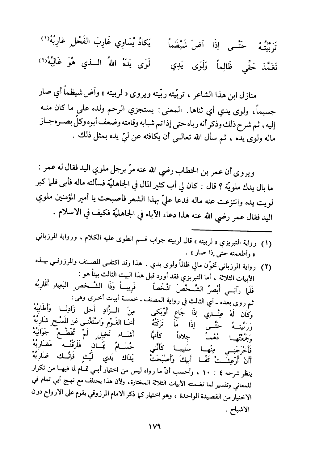 منازل ابن هذا الشاعر، تربيته ربيته ويروى "لربيته" وآض شيظمًا أي صار جسيمصا، ولوى يدي أي ثناها. المعنى: يستجزي الرحم ولده على ما كان منه إليه، ثم شرح ذلك وذكر أنه رباه حتى إذا تم شبابه وقامته وضعف أبوه وكل بصره جاز ماله ولوى يده، ثم سأل الله تعالى أن يكافئه عن لي يده بمثل ذلك.