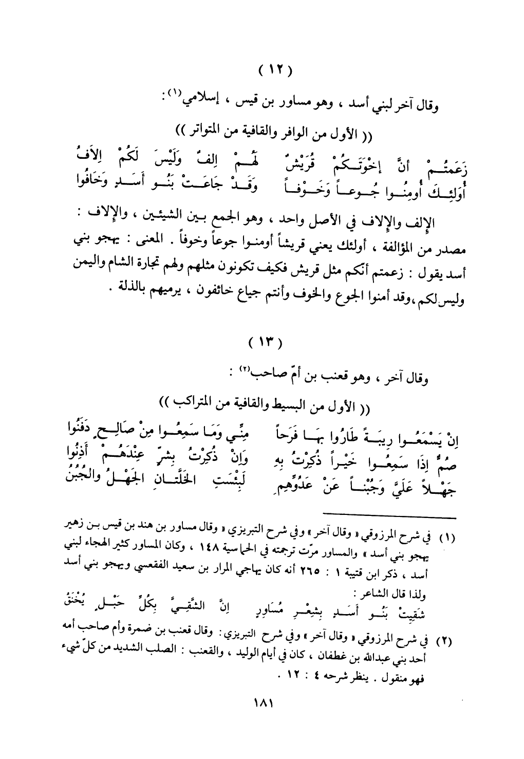 الإلف والإلاف في الأصل واحد، وهو الجمع بين الشيئين، والإلاف: مصدر من المؤالفة، أولئك يعني قريشًا أومنوا جوعًا وخوفًا. المعنى: يهجو بني أسد يقول: زعمتم أنكم مثل قريش فكيف تكونون مثلهم ولهم تجارة الشام واليمن وليس لكم، وقد أمنوا الجوع والخوف وأنتم جياع خائفون، يرميهم بالذلة.