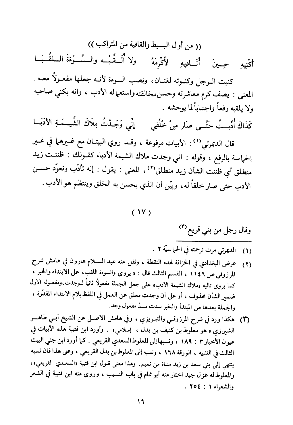قال الديمرتي: الأبيات مرفوعة, وقد روي البيتان مع غيرهما في غير الحماسة بالرفع, وقوله: إني وجدت ملاك الشيمة الأدباء كقولك: ظنتت زيد منطلق أي ظنتت الشأن زيد منطلق, المعنى: يقول: إنه تأدب تعود حسن الأدب حتى صار خلقًا له, وبين أن الذي يحسن به الخلق وينتظم هو الأدب.