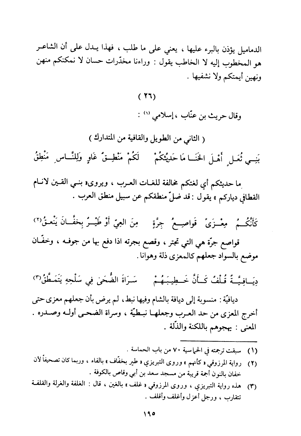 ما حديثكم أي لغتكم مخالفة للغات العرب، ويروى "بني القين لانام القطافي دياركم" يقول: قد ضل منطقكم عن سبيل منطق العرب.