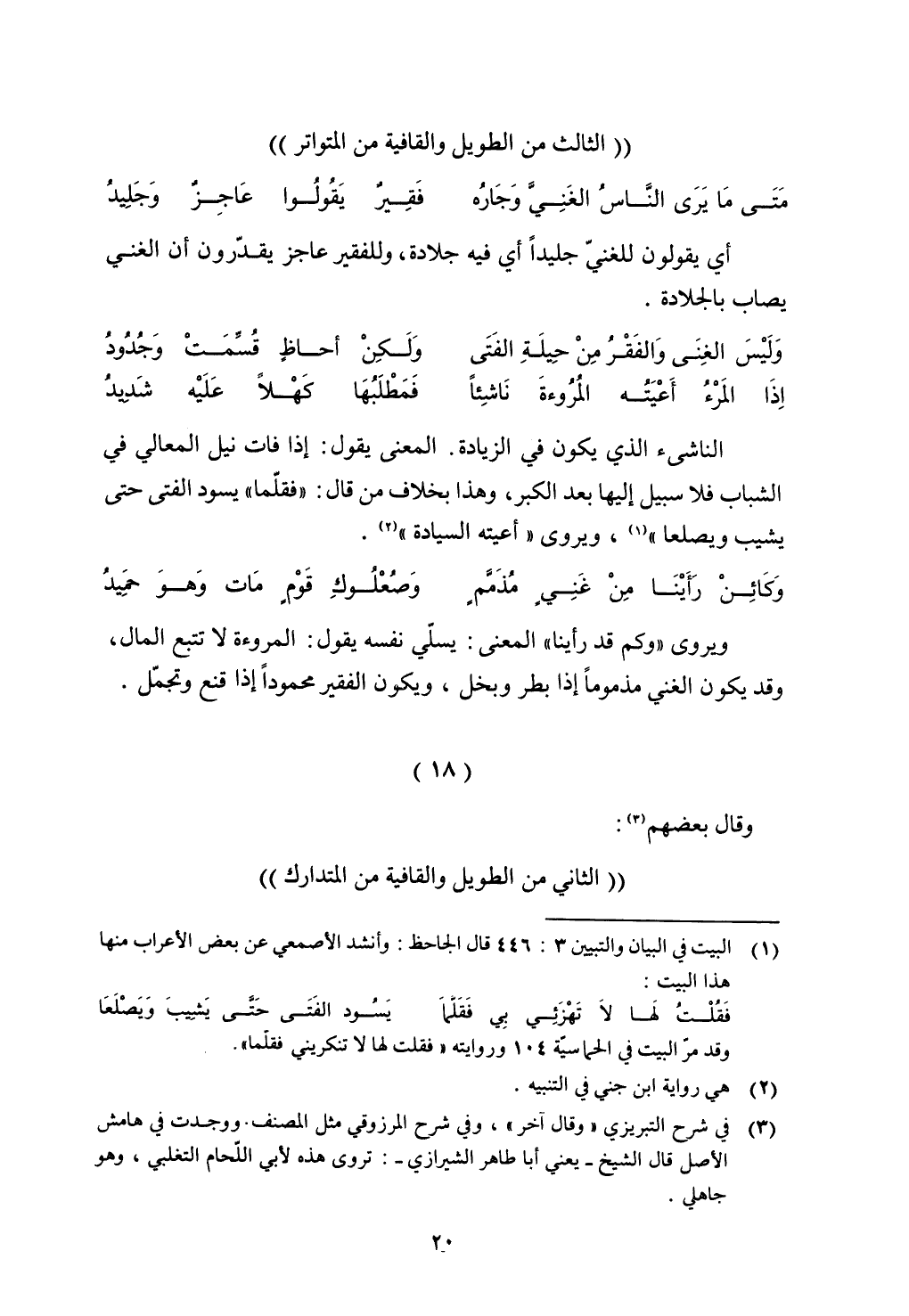 ويروى ((وكم قد رأينا)) المعنى: يسلي نفسه يقول: المرءة لا تتبع المال, وقد يكون الغني مذمومًا إذا بطر وبخل, ويكن الفقير محمودًا إذا قنع وتجمل.