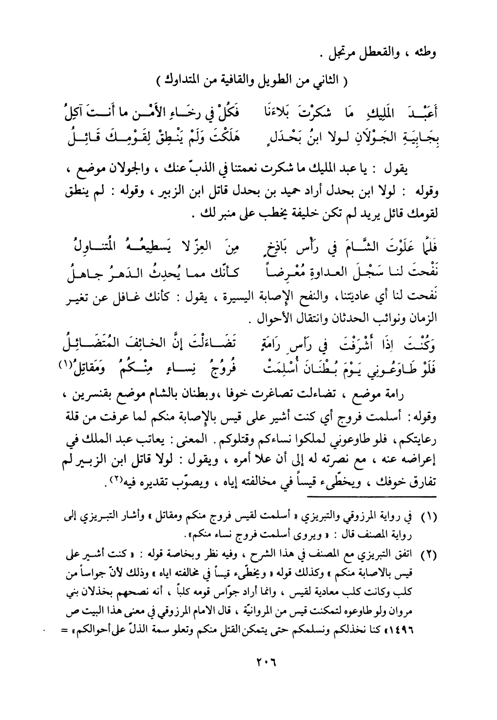رامة موضع، تضاءلت تصاغرت خوفًا، وبطنان بالشام موضع بقنسرين، وقوله: أسلمت فروج أي كنت أشير على قيس بالإضافة منكم لما عرفت من قلة رعايتكم، فلو طاوعوني لملكوا نساءكم وقتلوكم. المعنى: يعاتب عبد الملك في إعراضه عنه، مع نصرته له إلى أن علا أمره، ويقول: لولا قاتل ابن الزبير لم تفارق خوفك، ويخطئ قيسًا في مخالفته إياه، ويصوب تقديره فيه.