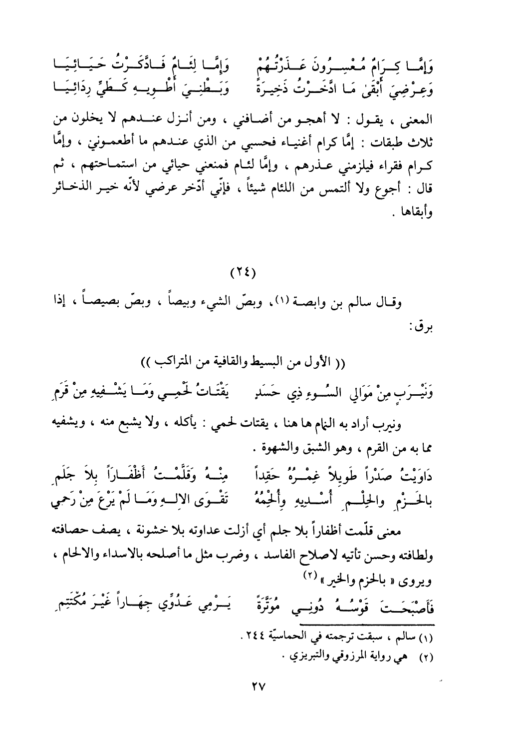 المعنى, يقول: لا أهجو من أضافني, ومن أنزل عندهم لا يخلون من ثلاث طبقات: إما كرام أغنياء فحسبي من الذي عندهم ما أطعموني, وإما كرام فقراء فيلزمني عذرهم, وإما لئام فمعني حيائي من استماحتهم, ثم قال: أجوع ولا ألتمس من اللئام شيئًا, فإني أدخر عرضي لأنه خير الذخائر وأبقاها.