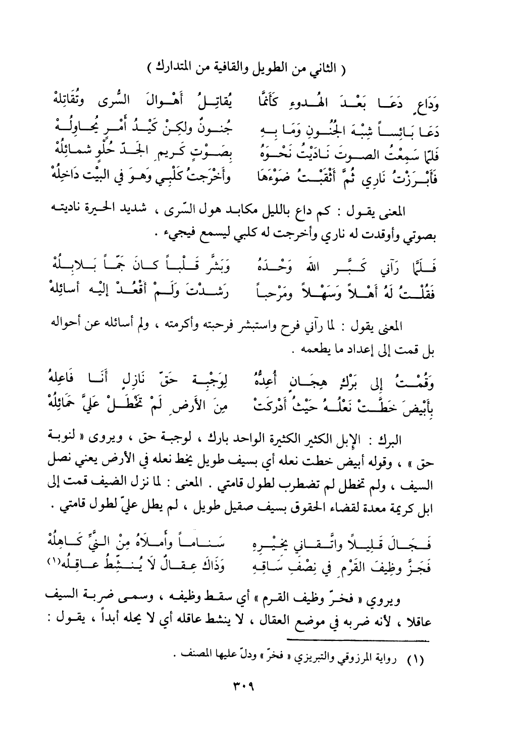 البرك: الإبل الكثيرة الكثيرة الواحد بارك, لوجبة حق, ويروى ((لنوبة حق)) , وقوله أبيض خطت نعله أي بسيف طويل يخط نعله في الأرض يعني نصل السيف, ولم تخطل لم تضطرب لطول قامتي. المعنى: لما نزل الضيف قمت إلى ابل كريمة معدة لقضاء الحقوق بسيف صقيل طويل, لم يطل علي لطول قامتي.