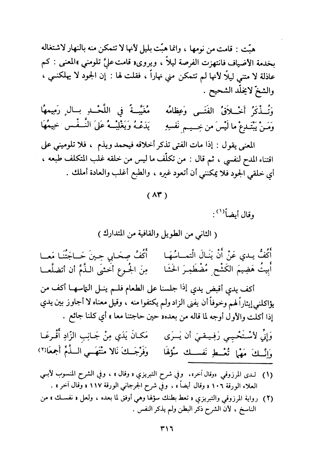 هبت: قامت من نومها, وإنما هبت بليل لأنها لا تتمكن منه بالنهار لاشتغاله بخدمة الضياف فانتهزت الفرصة ليلًا, ويروى ((قامت علي تلومني)) المعنى: كم عاذلة لا متني ليلًا لأنها تتمكن مني نهارًا, فقلت لها: إن الجود لا يهلكني, والشخ لا يخلد الشحيح.