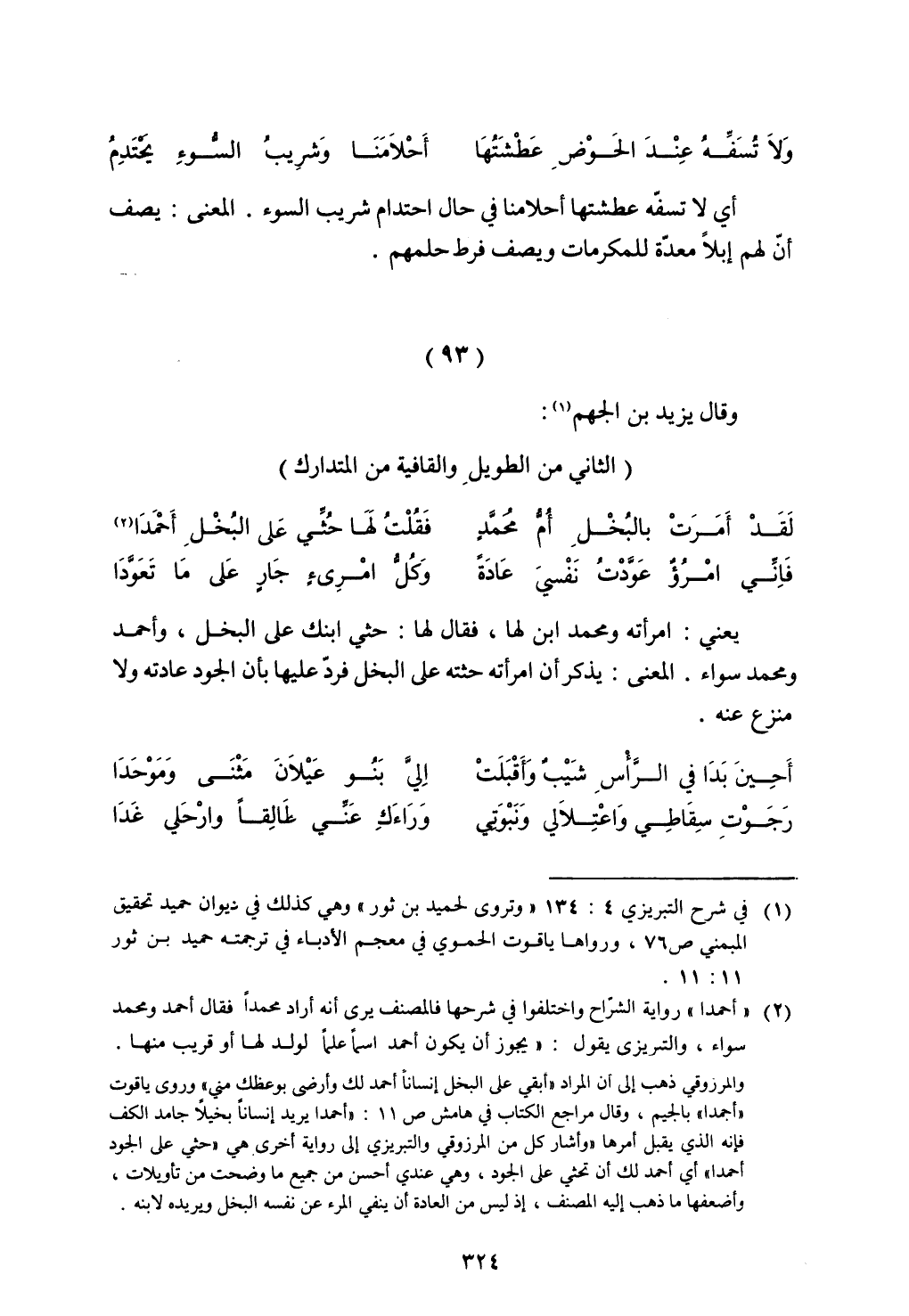 يعنى: امرأته ومحمد ابن لها، فقال لها: حثي ابنك على البخل، وأحمد ومحمد سواء. المعنى: يذكر أن امرأته على البخل فرد عليها بأن الجود عادته ولا منزع عنه.
