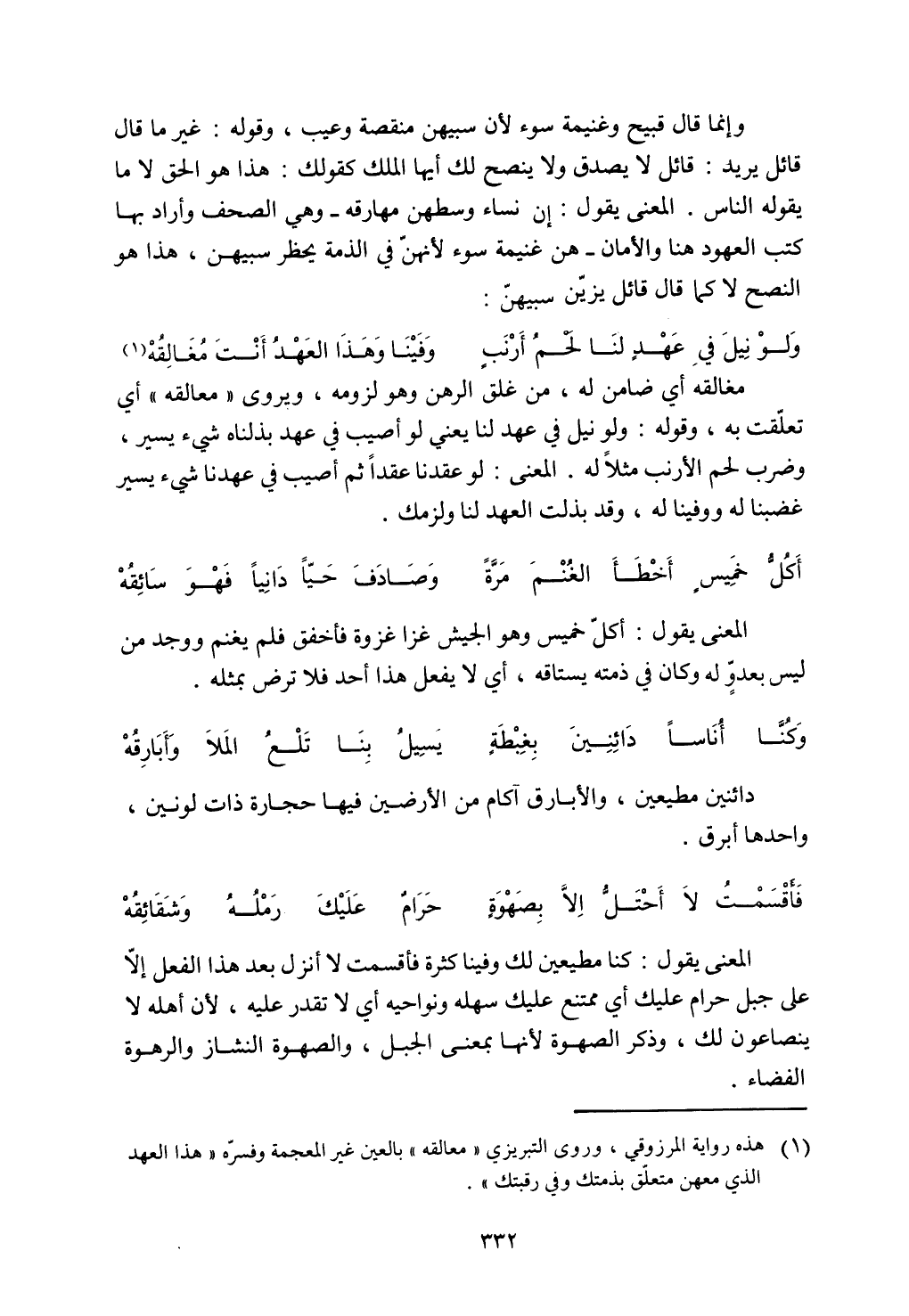 وإنما قال قبيح وغنيمة سوء لأن سبيهن منقصة وعيب، وقوله: غير ما قال قائل يريد: قائل لا يصدق ولا ينصح لك أيها الملك كقولك: هذا هو الحق لا ما يقوله الناس. المعنى يقول: إن نساء وسطهن مهارقه- وهي الصحف وأراد بها كتب العهود هما والأمان- هن غنيمة سوء لأنهن في الذمة يحظر سبيهن، هذا هو النصح لا كما قال قائل يزين سبيهن: