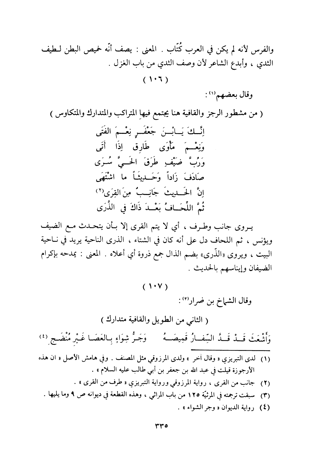 يروى جانب وطرف، أي لا يتم القرى إلا بأن يتحدث مع الضيف ويؤنس، ثم اللحاف دل على أنه كان في الشتاء، الذرى الناحية يريد في ناحية البيت، ويروى ((الذرى)) بضم الذال جمع ذروة أي ـعلاه. المعنى: يمدحه بإكرام الضيفان وإيناسهم بالحديث.