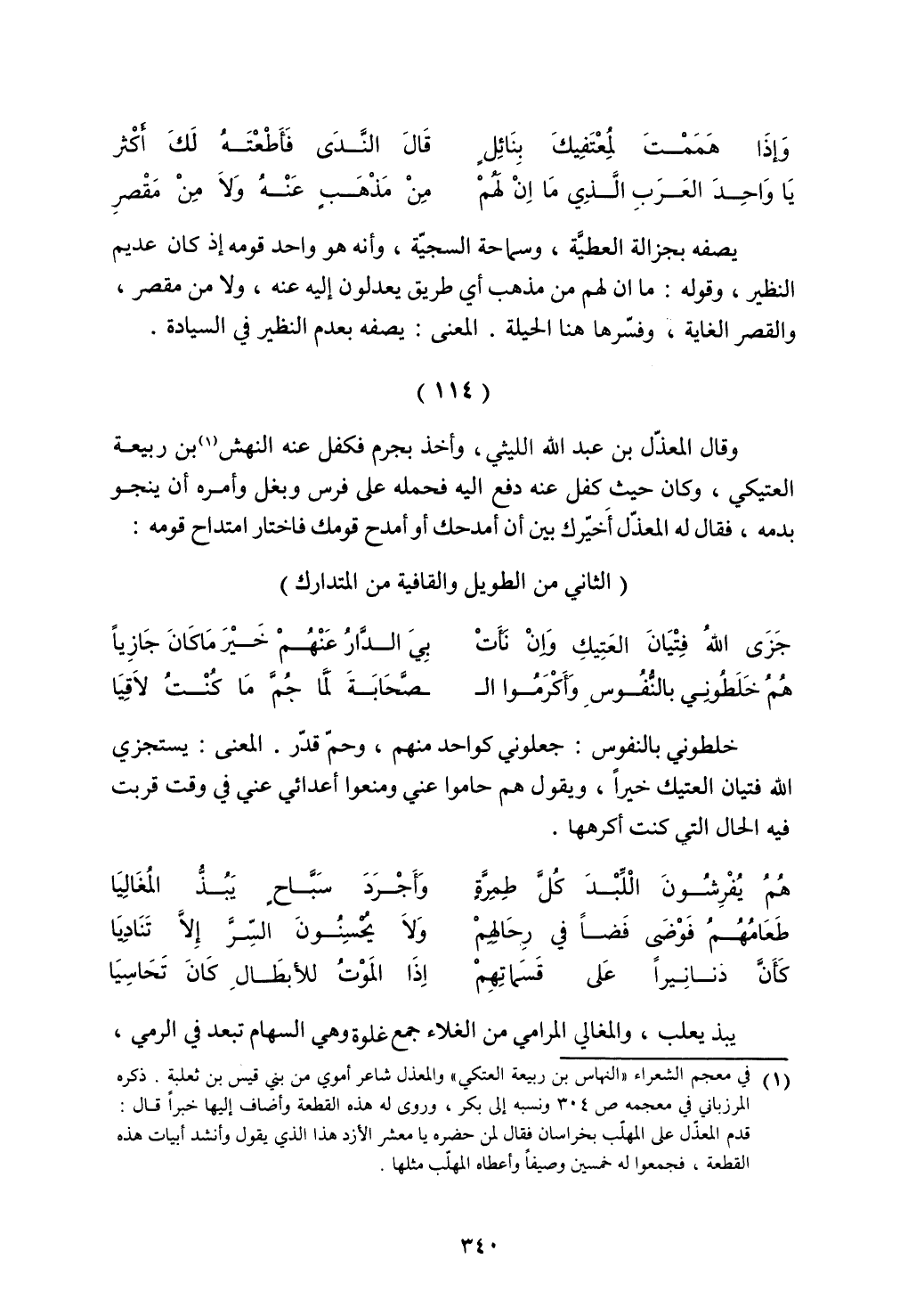 وقال المعذل بن عبد الله الليثي، وأخذ بجرم فكفل عنه النهش بن ربيعة العتيكي، وكان حيث كفل عنه دفع إليه فحمله على فرس وبغل وأمره أن ينجو بدمه، فقال له المعذل أخيرك بين أن أمدحك أو أمدح قومك فاختار امتداح قومه: