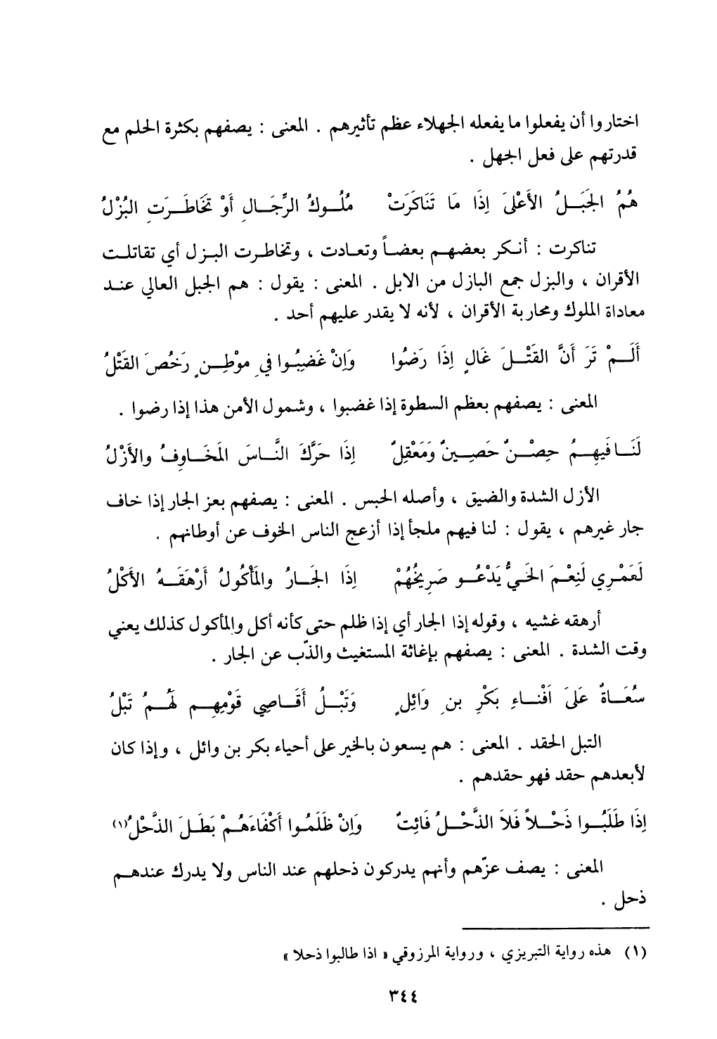 تناكرت: أنكر بعضهم بعضًا وتعادت، وتخاطرت البزل أي تقاتلت الأقران، والبزل جمع البازل من الإبل. المعنى: يقول: هم الجبل العالي عند معاداة الملوك ومحاربة القرآن، لأنه لا يقدر عليهم أحد.