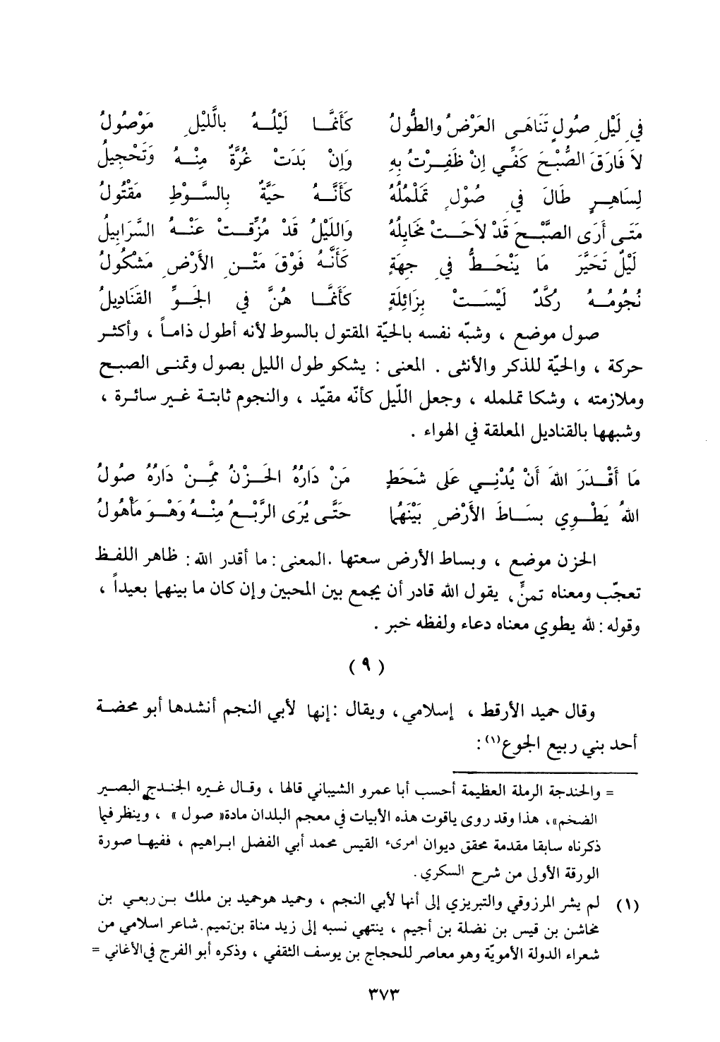صول موضع، وشبه نفسه بالحية المقتول بالسوط لأنه أطول ذاما، وأكثر حركة، والحية للذكر والأنثى، المعنى: يشكو طول الليل بصول وتمني الصبح وملازمته، وشكا تململه، وجعله الليل كأنه مقيد، والنجوم ثابتة غير سائرة، وشبهها بالقناديل المعلقة في الهواء.