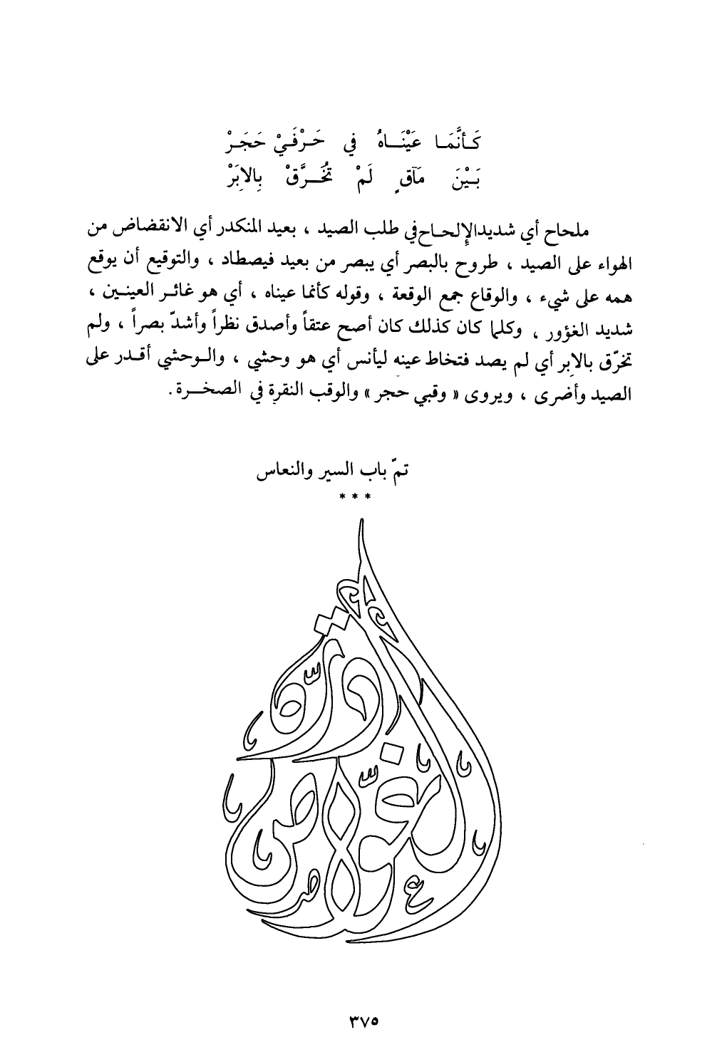 ملحاح أي شديد الإلحاح في طلب الصيد، بعيد المنكدر أي الانقضاض من الهواءعلى الصيد، طروح بالبصر أي يبصر من بعيد فيصطاد، والتوقيع أن يوقع همه على شيء، والوقاع جمع الوقعة، وقوله كأنما عيناه، أي هو غائر العينين، شديد الغؤور، وكلما كان كذلك كان أصح عتقا وأصدق نظرا وأشد بصرا، ولم تخرق بالإبر أي لم يصد فتخاط عينه ليأنس أي هو وحشي، والوحشي أقدر على الصيد وأضرى، ويروى "وقبي حجر" والوقب النقرة في الصخرة.