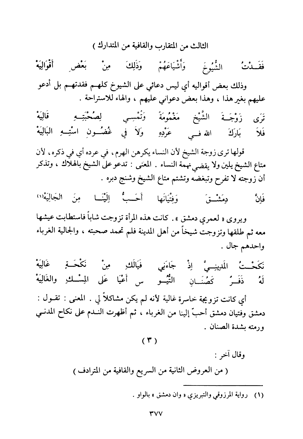 ويروى "لعمري دمشق" كانت هذه المرأة تزوجت شابا فاستطابت عيشها معه ثم طلقها وتزوجت شيخا من أهل المدينة فلم تحمد صحبته، والجالية الغرباء واحدهم جال.