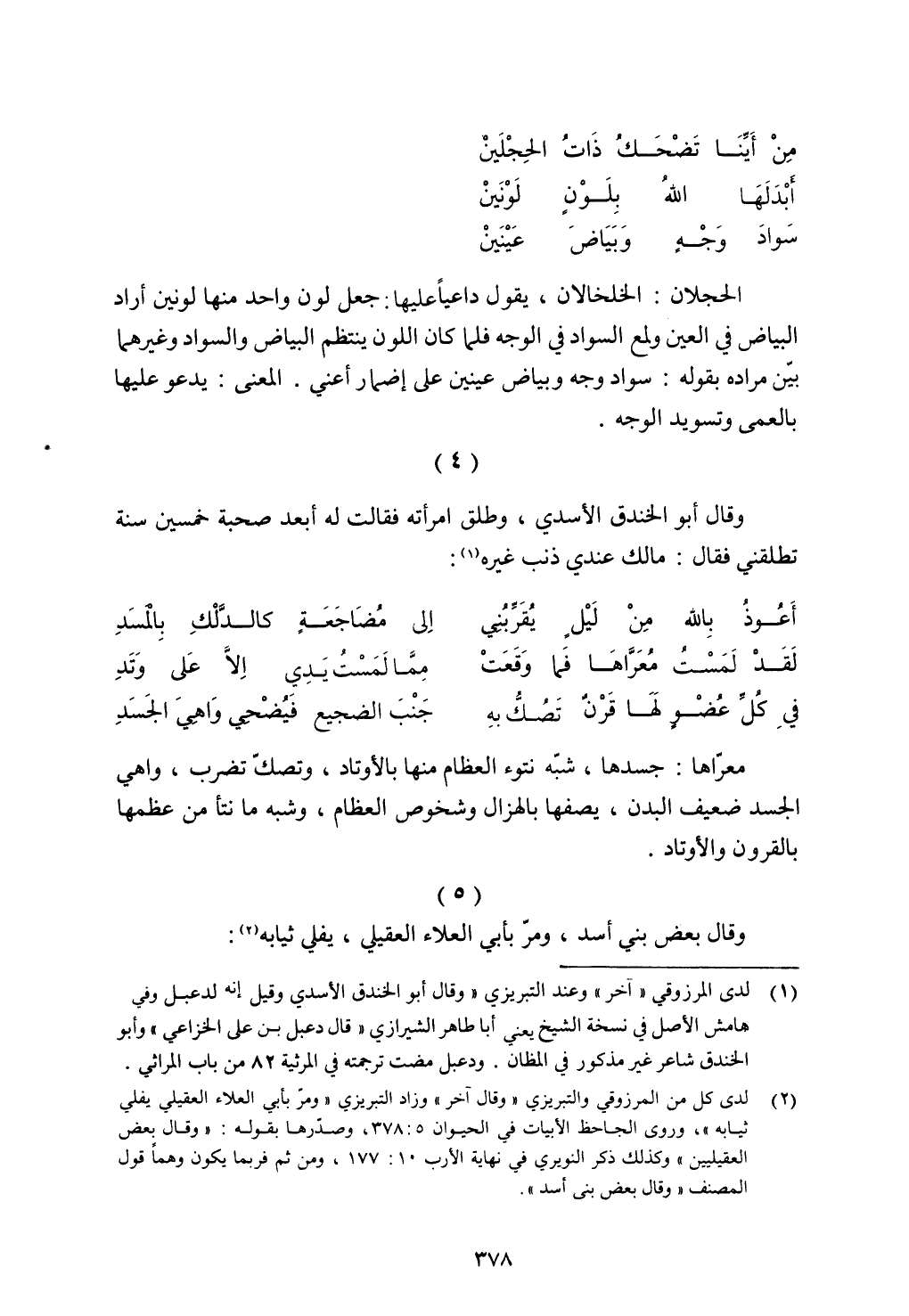 الحجلان: الخلخالان، يقول داعيا عليها: جعل لون واحد منها لونين أراد البياض في العين ولمع السواد في الوجه فلما كان اللون ينتظم البياض والسواد وغيرهما بين مراده بقوله: سواد وجه وبياض عينين على إضمار أعني، المعنى: يدعو عليها بالعمى وتسويد الوجه.