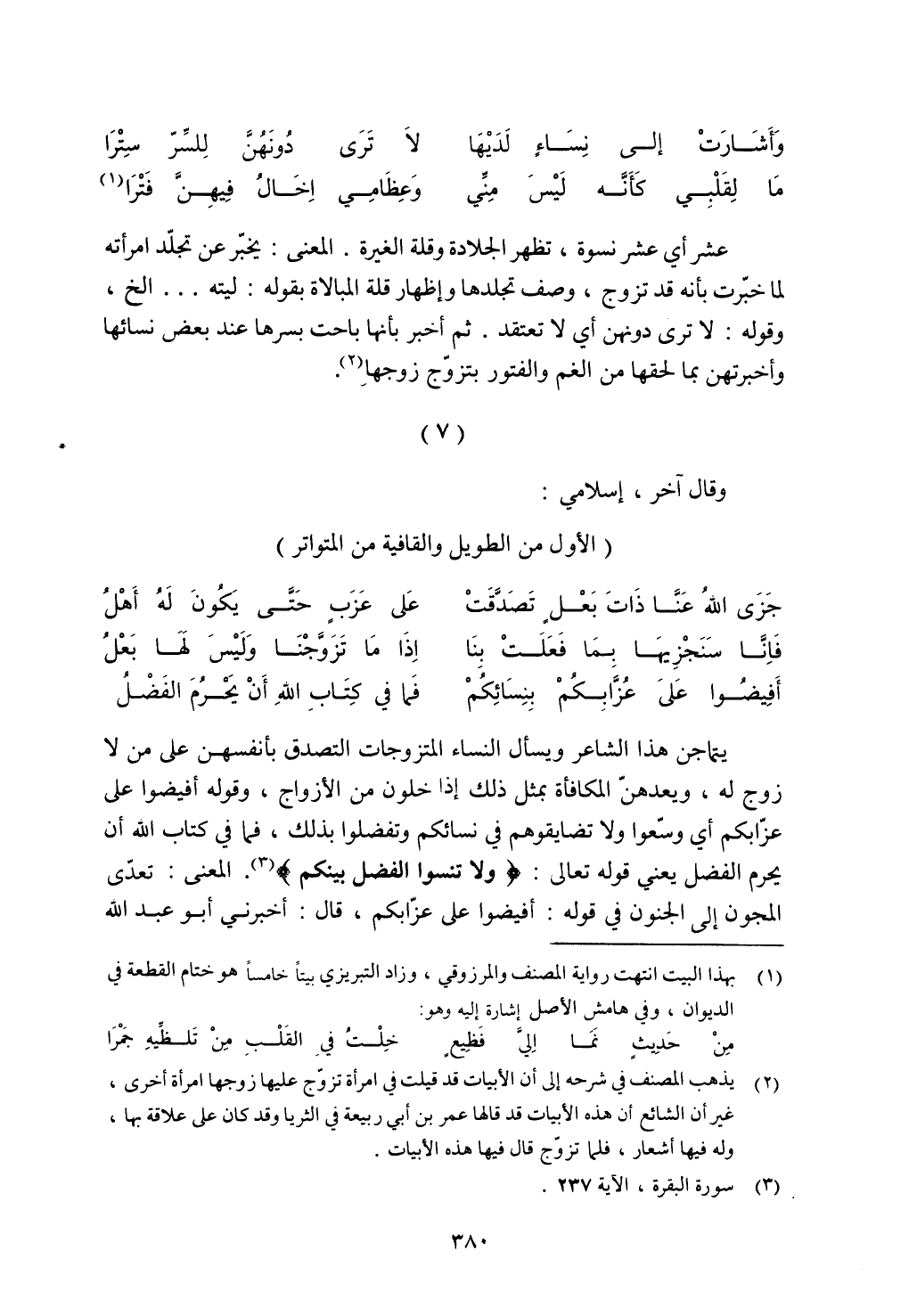 يتماجن هذا الشاعر ويسأل النساء المتزوجات التصدق بأنفسهن على من لا زوج له، ويعدهن المكافأة بمثل ذلك إذا خلون من الأزواج، وقوله أفيضوا على عزابكم أي وسعوا ولا تضايقوهم في نسائكم وتفضلوا بذلك، فما في كتاب الله أن يحرم الفضل يعني قوله تعالى: (ولا تنسوا الفضل بينكم). المعنى: تعدى المجون إلى الجنون في قوله: أفيضوا على عزابكم، قال: أخبرني أبو عبد الله