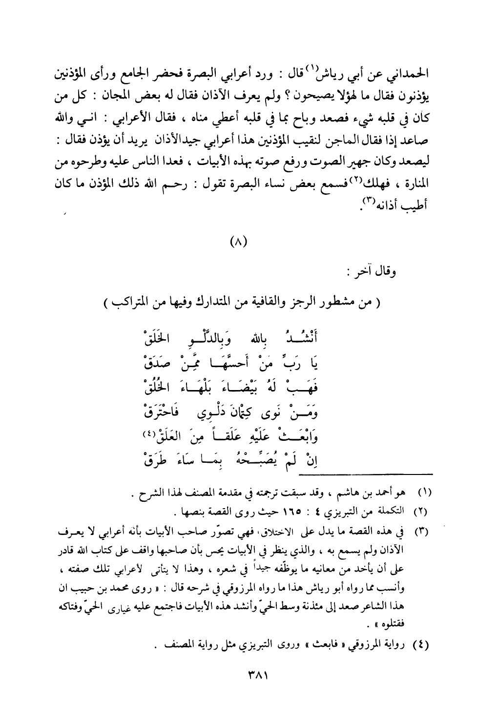 الحمداني عن أبي رياش قال: ورد أعرابي البصرة فحضر الجامع ورأى المؤذنين يؤذنون فقال ما لهؤلاء يصيحون؟ ولم يعرف الآذان فقال له بعض المجان: كل من كان في قلبه شيء فصعد وباح بما في قلبه أعطي مناه، فقال الأعرابي: إني والله صاعد إذا فقال الماجن لنقيب المؤذنين هذا أعرابي جيد الأذان يريد أن يؤذن فقال: ليصعد وكان جهير الصوت ورفع صوته بهذه الأبيات، فعدا الناس عليه وطرحوه من المنارة، فهلك فسمع بعض نساء البصرة تقول: رحم الله ذلك المؤذن ما كان أطيب أذانه.