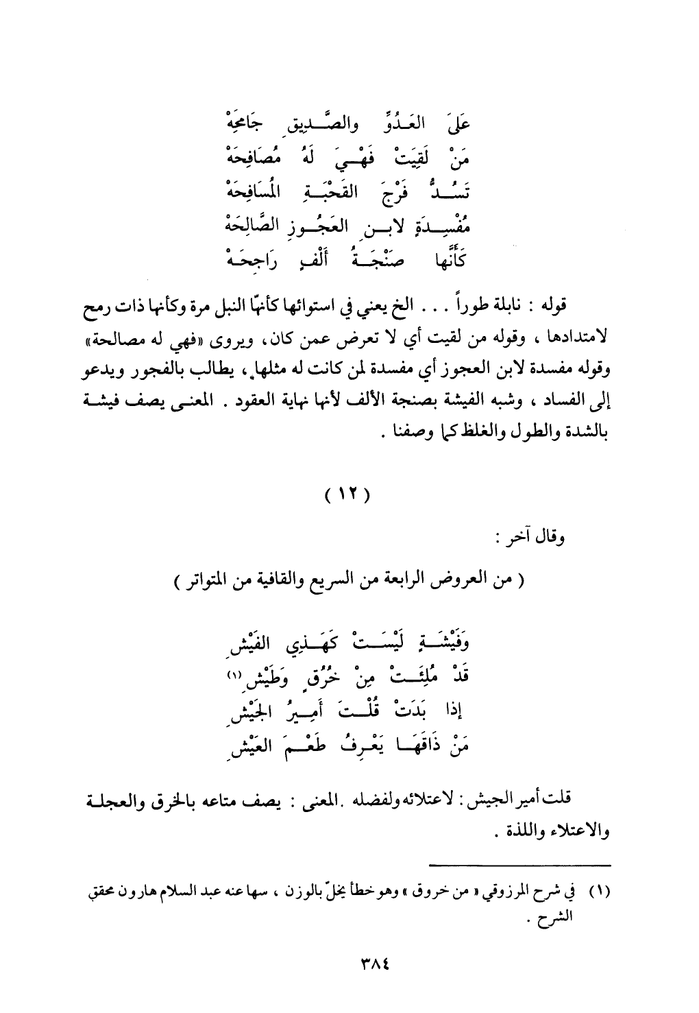 قوله: نابلة طورا ... إلخ يعني في استوائها كأنها النبل مرة وكأنها ذات رمح لامتدادها، وقوله من لقيت أي لا تعرض عمن كان، ويروى "فهي مصالحة" وقوله مفسدة لابن العجوز أي مفسدة لمن كانت له مثلها، يطالب بالفجور ويدعو إلى الفساد، وشبه الفيشة بصنجة الألف لأنها نهاية العقود. المعنى يصف فيشة بالشدة والطول والغلظ كما وصفنا.