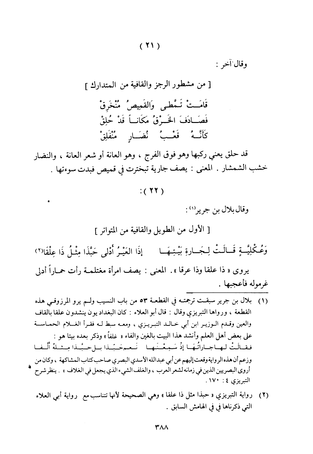 يروى "ذا علقا وذا عرقا". المعنى: يصف امرأة مغتلمة رأت حمارا أدلى غرموله فأعجبها.