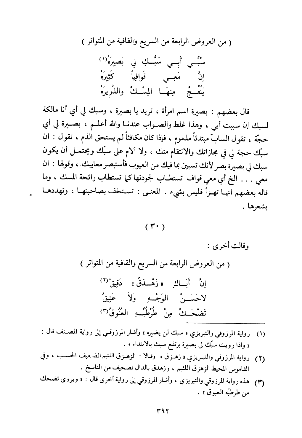 قال بعضهم: بصيرة اسم امرأة، تريد يا بصيرة، وسبك لي أي أنا مالكة لسبك إن سببت أبي، وهذا غلط والصواب عندنا والله أعلم، بصيرة لي أي حجة، تقول الساب مبتدئا مذموم، فإذا كان مكافئا لم يستحق الذم، تقول: إن سبك حجة لي في مجازاتك والانتقام منك، ولا ألام على سبك ويحتمل أن يكون سبك لي بصيرة بصر لأنك تسبين بما فيك من العيوب فأستبصر معايبك، وقولها: إن معي ... إلخ أي معي قواف تستطاب لجودتها كما تستطاب رائحة المسك، وما قاله بعضهم أنها تهزأ فليس بشيء. المعنى: تستخف بصاحبتها، وتهددها بشعرها.