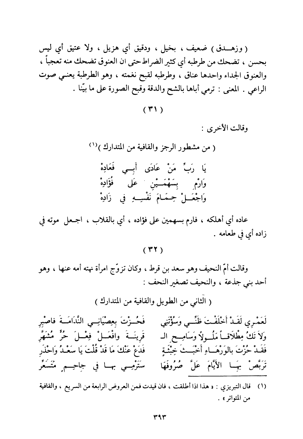 (وزهدق) ضعيف، بخيل، ودقيق أي هزيل، ولا عتيق أي ليس بحسن، تضحك من طرطبه أي كثير الضراط حتى أن العنوق تضحك منه تعجبا، والعنوق الجداء واحدها عناق، وطرطبه لقبح نغمته، وهو الطرطبة يعني صوت الراعي. المعنى: ترمي أباها بالشح والدقة وقبح الصورة على ما بينا.