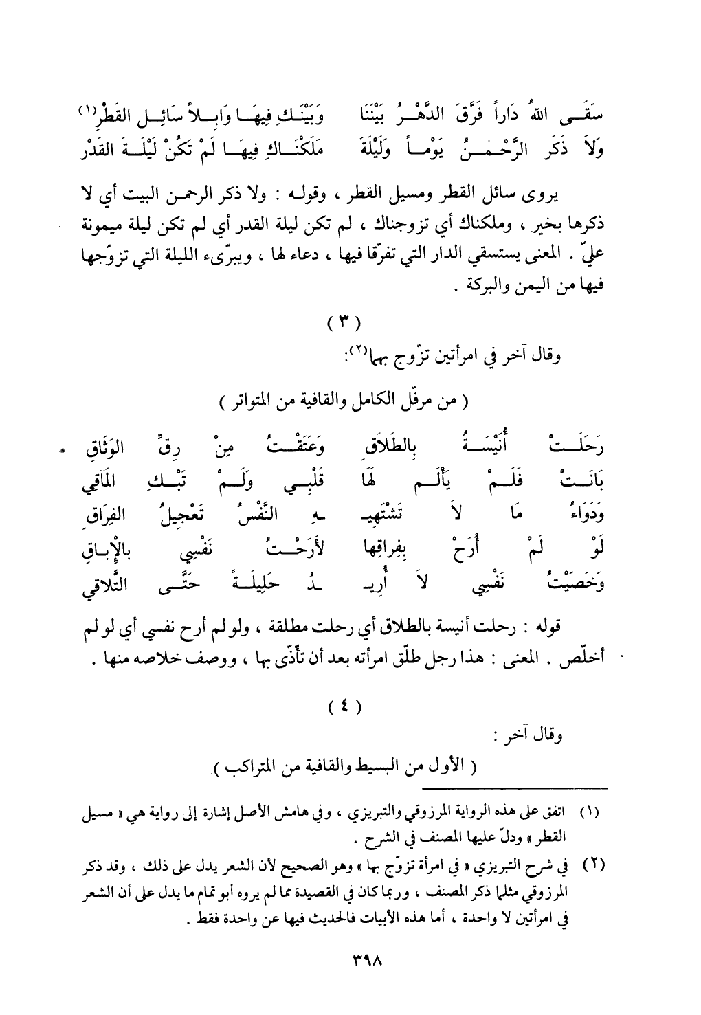 يروى سائل القطر ومسيل القطر، وقوله: ولا ذكر الرحمن البيت أي لا ذكرها بخير، وملكناك أي تزوجناك، لم تكن ليلة القدر أي لم تكن ليلة ميمونة علي. المعنى يستسقي الدار التي تفرقا فيها، دعاء لها، ويبريء الليلة التي تزوجها فيها من اليمن والبركة.