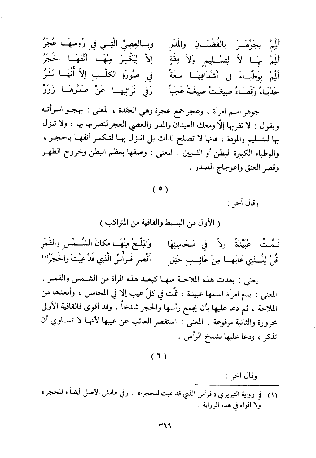 المعنى: يذم امرأة اسمها عبيدة، وتمت في كل عيب إلا في المحاسن، وأبعدها من الملاحة، ثم دعا عليها بأن يجمع رأسها والحجر شدخا، وقد أقوى فالقافية الأولى مجرورة والثانية مرفوعة. المعنى: استقصر العائب عن عيبها لأنها لا تساوي أن تذكر، ودعا عليها بشدخ الرأس.