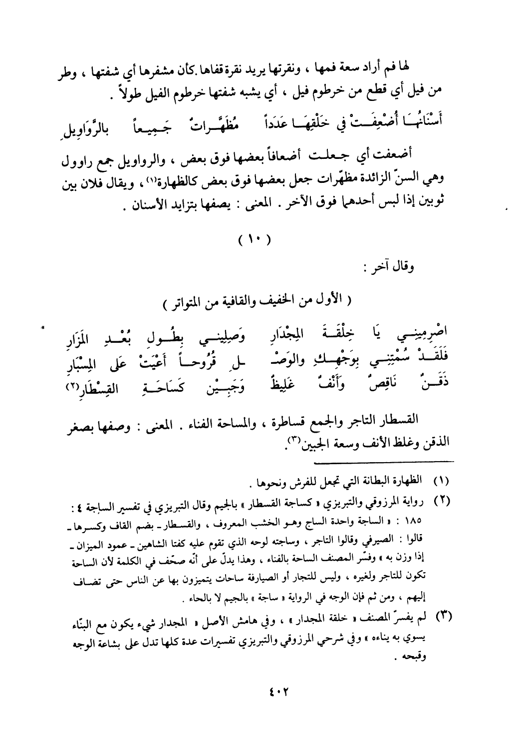 لها فم أراد سعة فمها، ونقرتها يريد نقرة قفاها. كأن مشفرها أي شفتها، وطر من فيل أي قطع من خرطوم فيل، أي يشبه شفتها خرطوم الفيل طولاً.