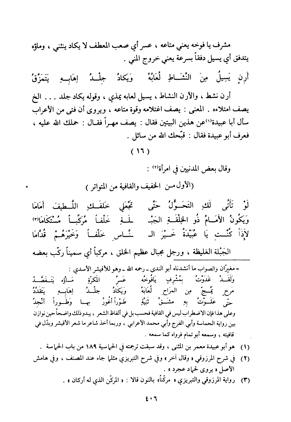 أرن نشط، والأرن النشاط، يسيل لعابه يمذي، وقوله يكاد جلد ... الخ يصف امتلاءه. المعنى: يصف اغتلامه وقوة متاعه، ويروى أن فتى من الأعراب سأل أبا عبيدة عن هذين البيتين فقال: يصف مهراً فقال: حملك الله عليه، فعرف أبو عبيدة فقال: قبحك الله من سائل.